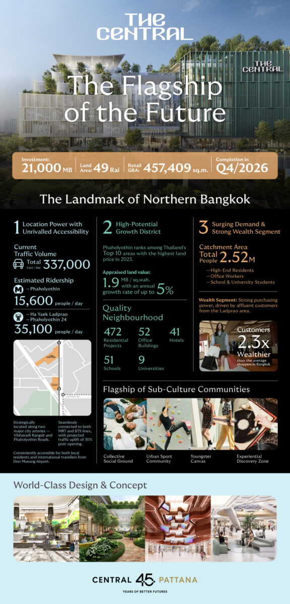 – Phaholyothin Rising with Potential on Par with Ratchaprasong: strategic location ideal for world-class development based on: 1) Transit-Oriented Development – anchored by major BTS, MRT and arterial roads, seamlessly connecting life, work and mobility; 2) High-Density & Mixed Demand – surrounded by mid- to high-end residences, offices, hotels and educational institutions; and 3) Anchor of Flagship Brands; – as centralwOrld stands as the “Flagship Landmark” of Ratchaprasong, The Central Phaholyothin will become “The Landmark of Northern Bangkok,” driving the district’s future growth.