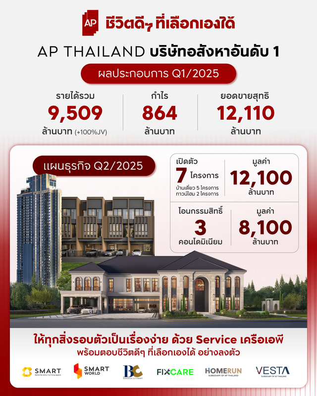 – AP Thailand with a promise of Cheevit Dee Dee Tee Lueak Eng Dai reveals operating results for the first quarter of the year where it continues to show strong growth in the industry with total revenues at Bht 9,509 million, net profit at Bht 864 million and net sales at Bht 12,110 million, further strengthening its goal to be the No. 1 property developer