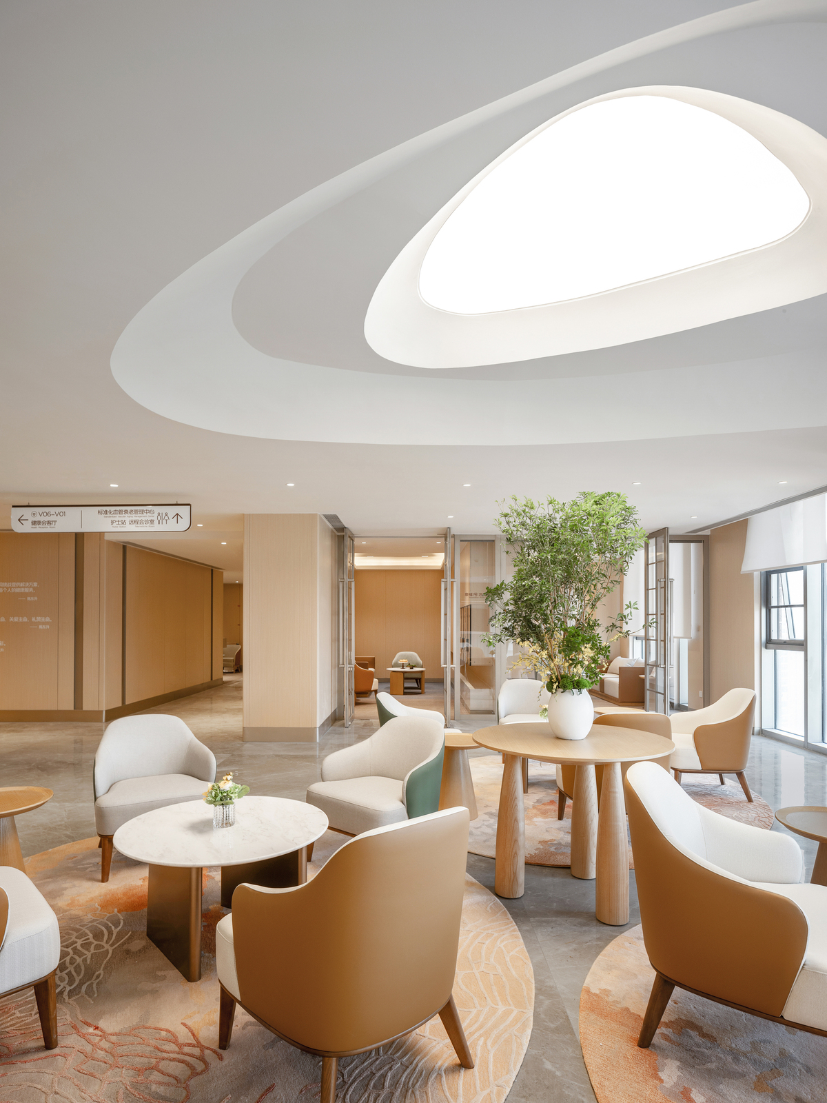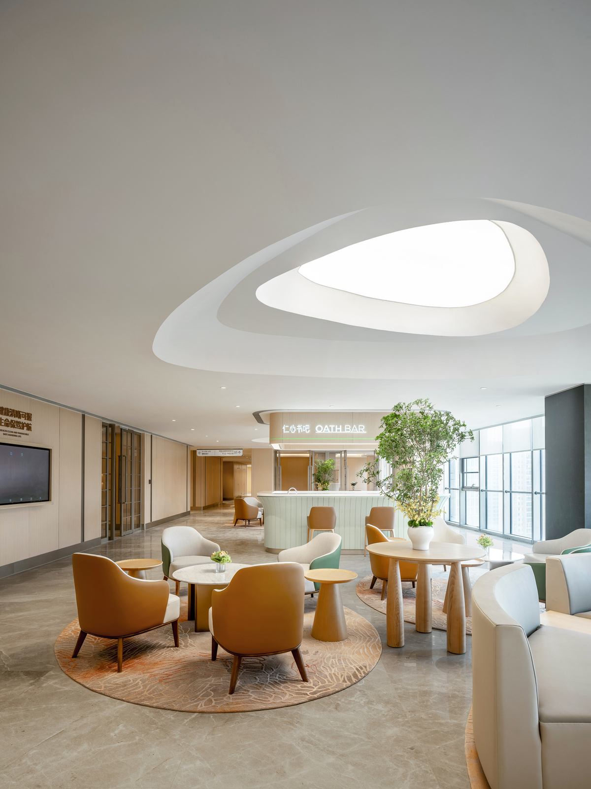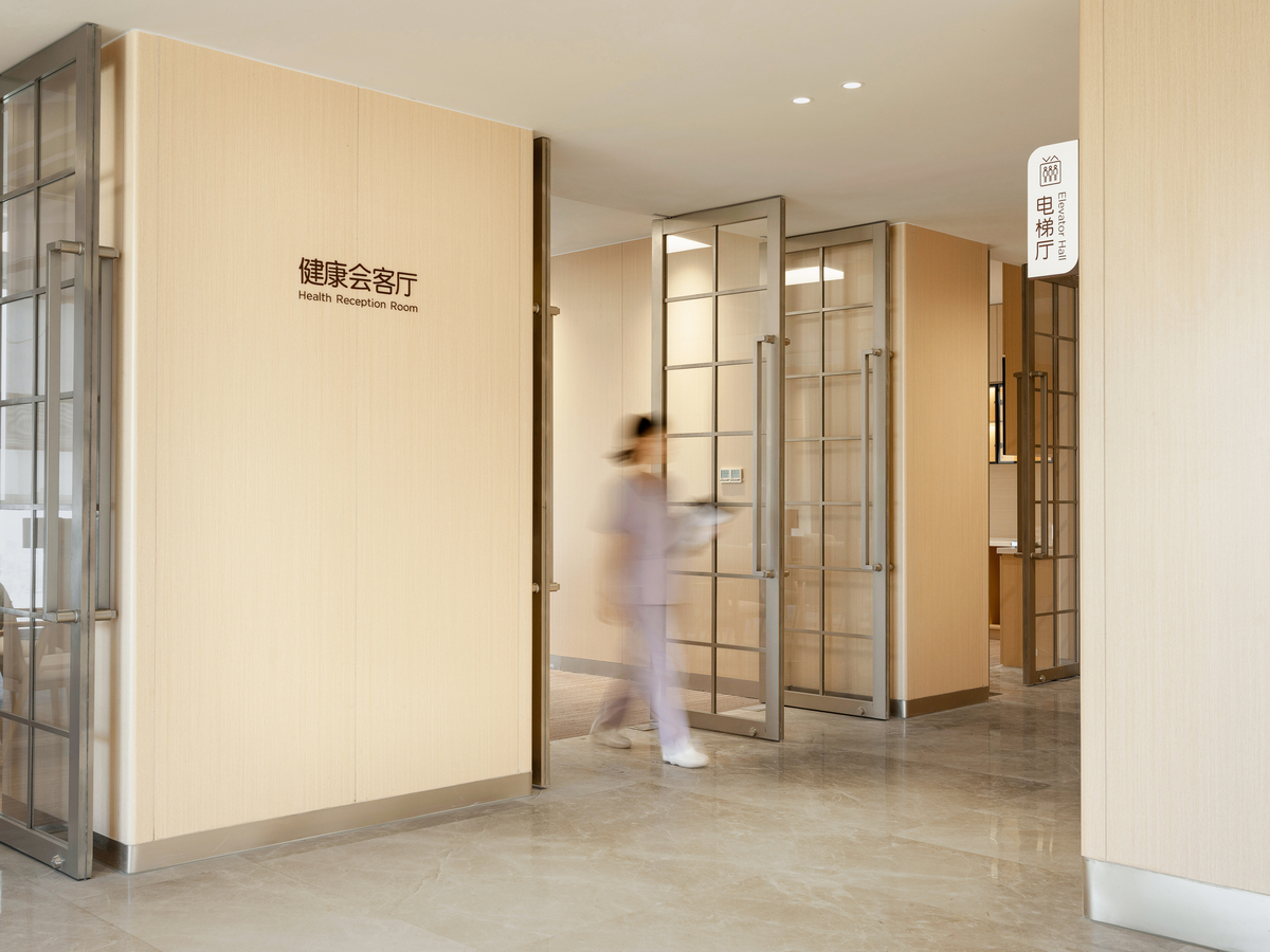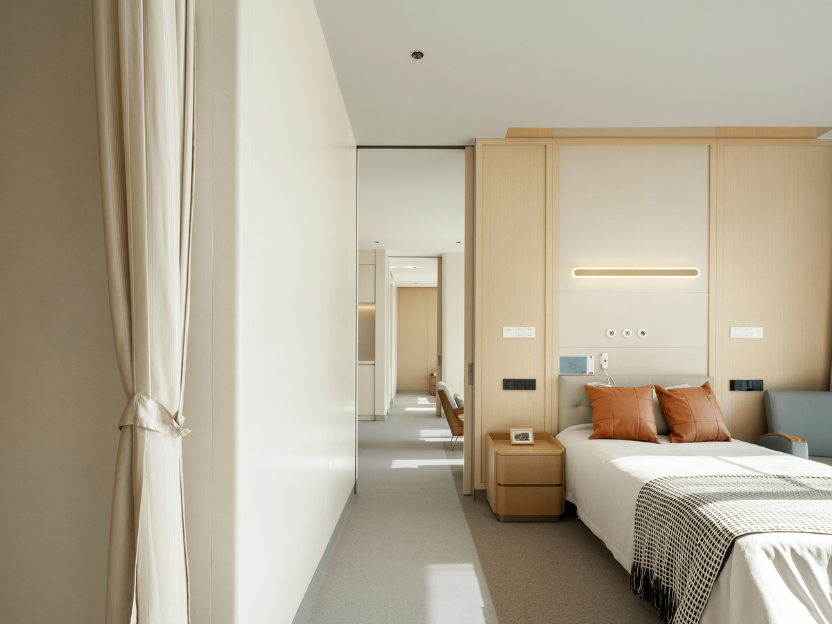 Natural light is maximized in public areas—including the health lounge and the Renxin Book Bar resting zone—creating a non-clinical, warm, and comforting atmosphere . Warm, simple materials and soft, elegant hues emphasize texture and a caring tactile and auditory experience . These elements give rise to interconnected yet independently functional spaces that encourage informal communication, mutual support, and sharing .