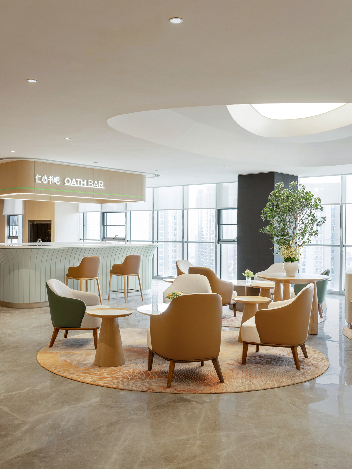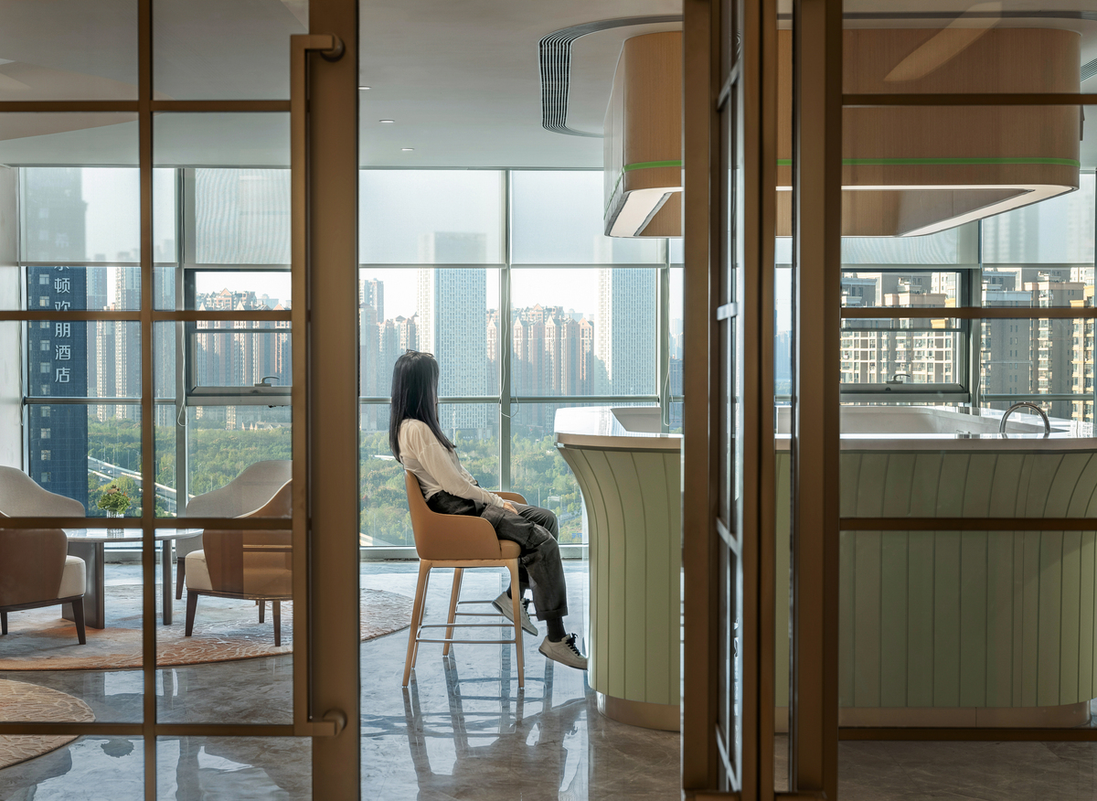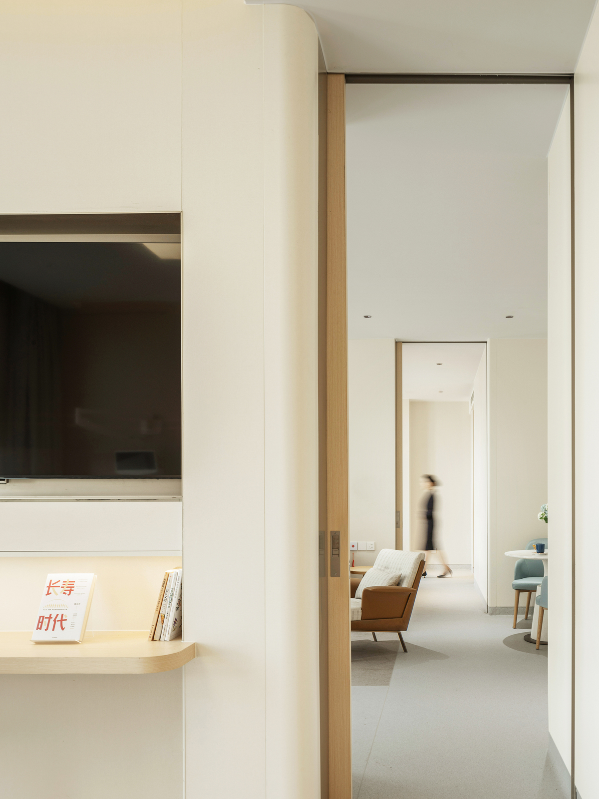 Natural light is maximized in public areas—including the health lounge and the Renxin Book Bar resting zone—creating a non-clinical, warm, and comforting atmosphere . Warm, simple materials and soft, elegant hues emphasize texture and a caring tactile and auditory experience . These elements give rise to interconnected yet independently functional spaces that encourage informal communication, mutual support, and sharing .