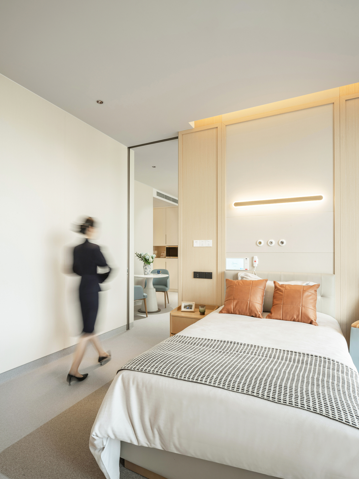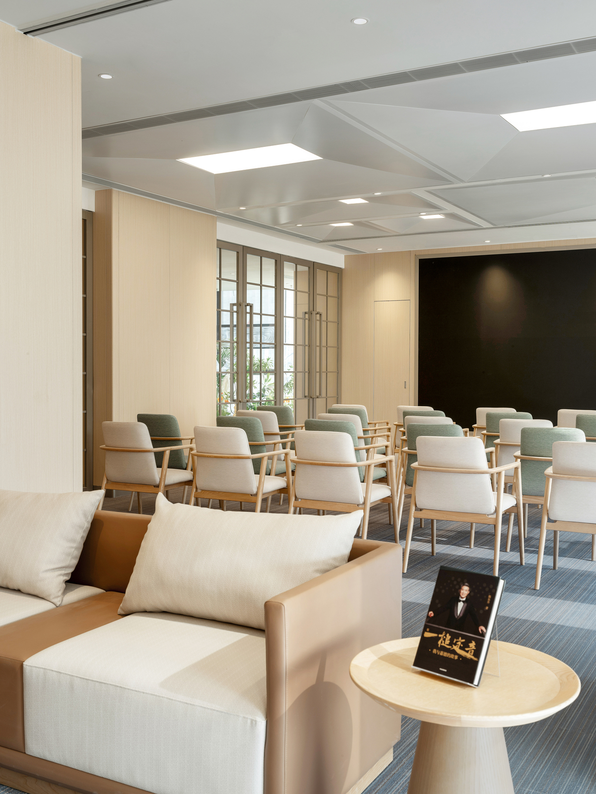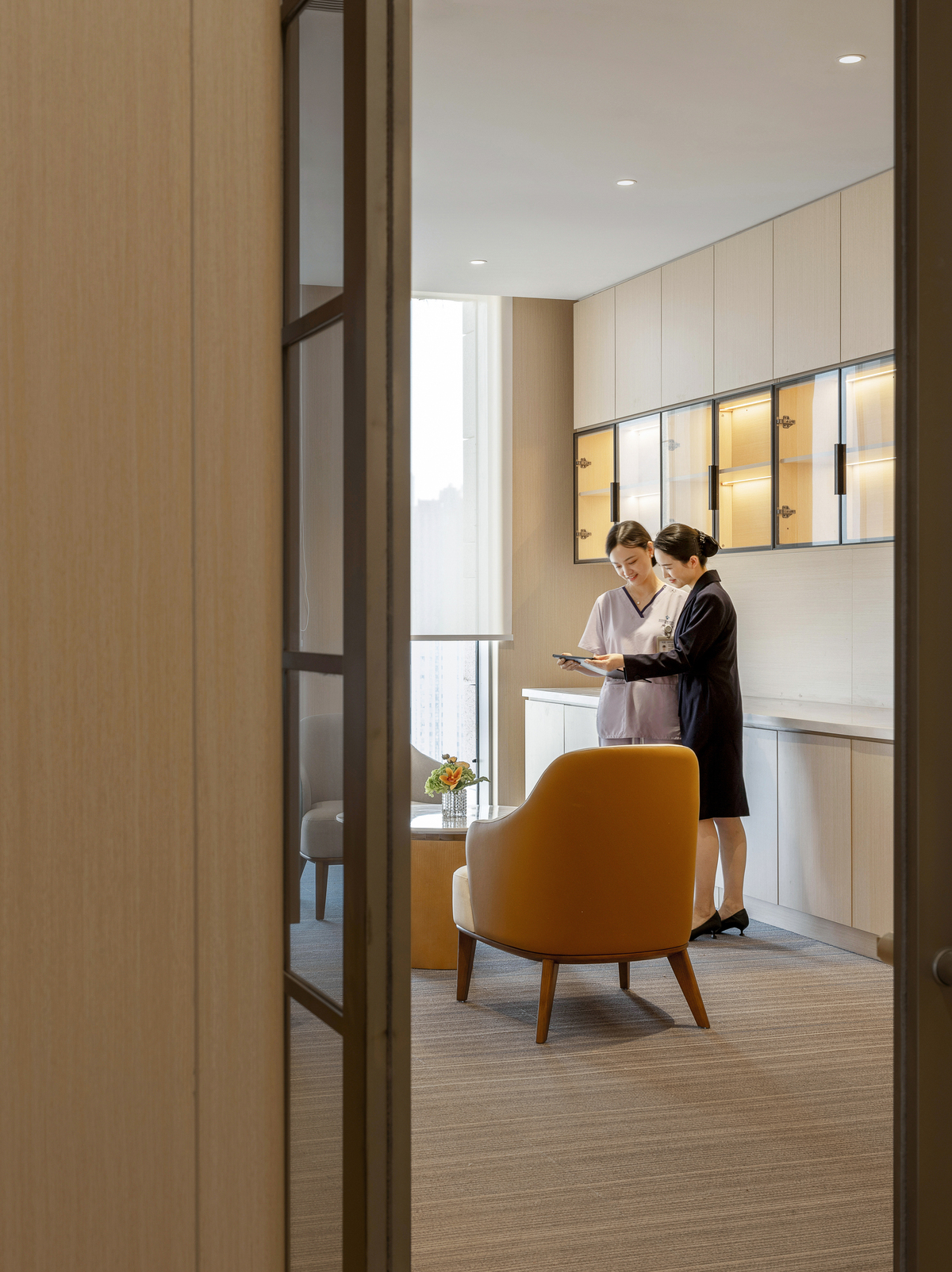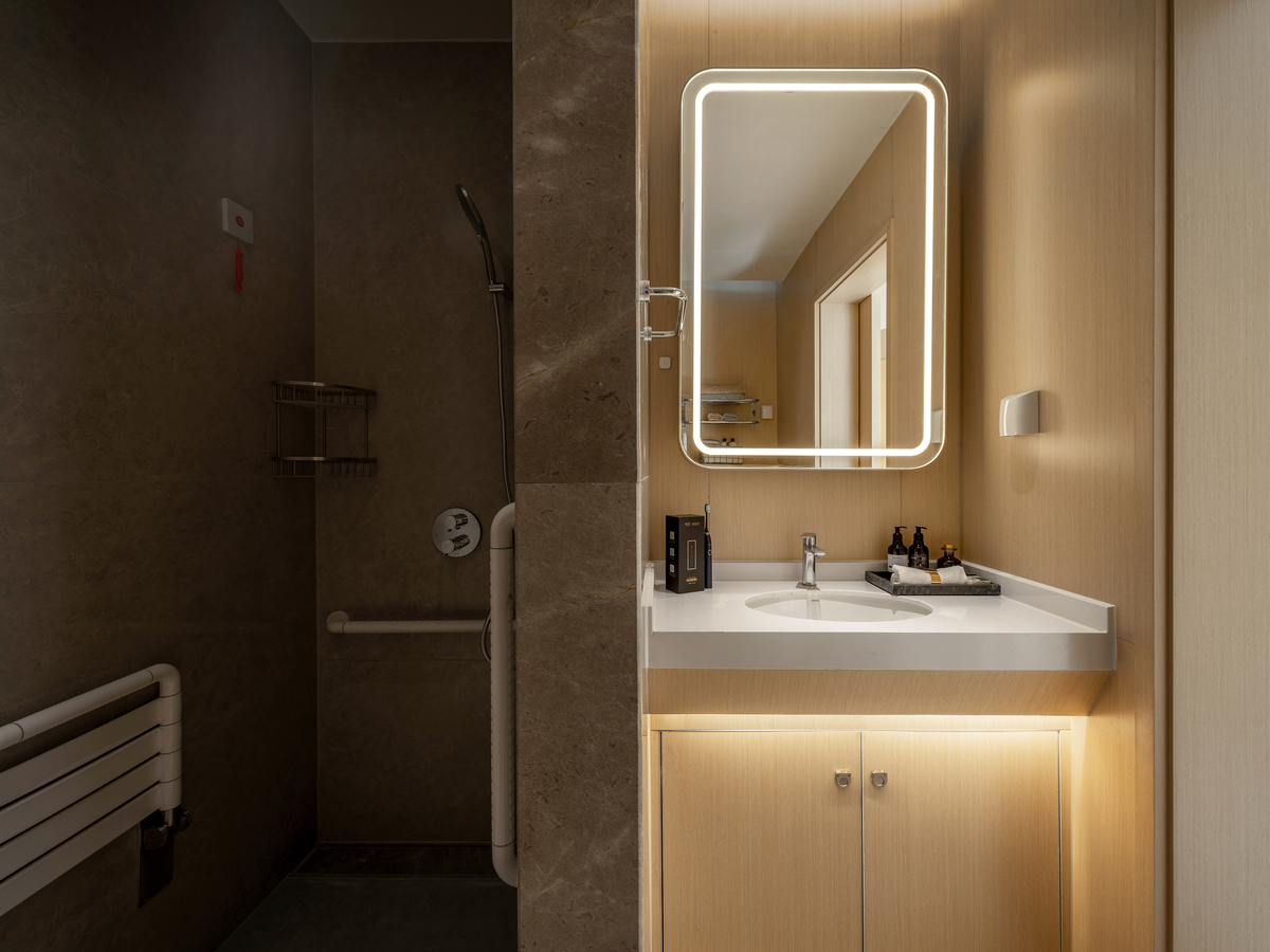 Natural light is maximized in public areas—including the health lounge and the Renxin Book Bar resting zone—creating a non-clinical, warm, and comforting atmosphere . Warm, simple materials and soft, elegant hues emphasize texture and a caring tactile and auditory experience . These elements give rise to interconnected yet independently functional spaces that encourage informal communication, mutual support, and sharing .