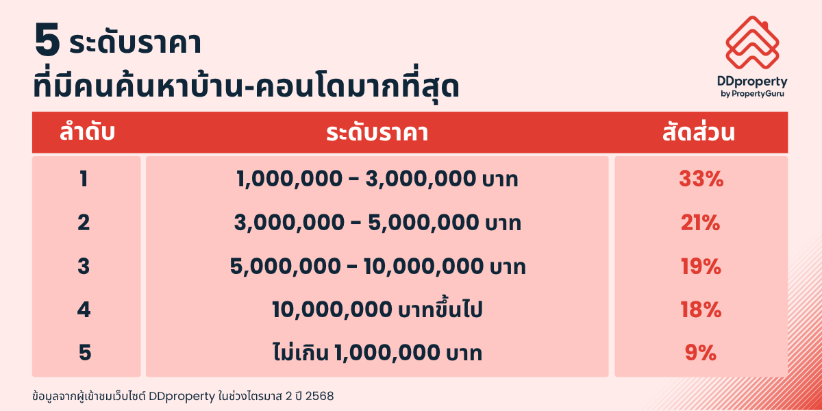 สอดคล้องกับข้อมูลจากผู้เข้าชมเว็บไซต์ DDproperty ในช่วงไตรมาส 2 ปี 2568 พบว่า ผู้เข้าชมเว็บไซต์มีความต้องการซื้อที่อยู่อาศัยไม่ว่าจะเป็นบ้านเดี่ยว ทาวน์โฮม และคอนโดฯ ในช่วงระดับราคา 1-3 ล้านบาทมากที่สุด โดยมีสัดส่วนมากถึง 33%