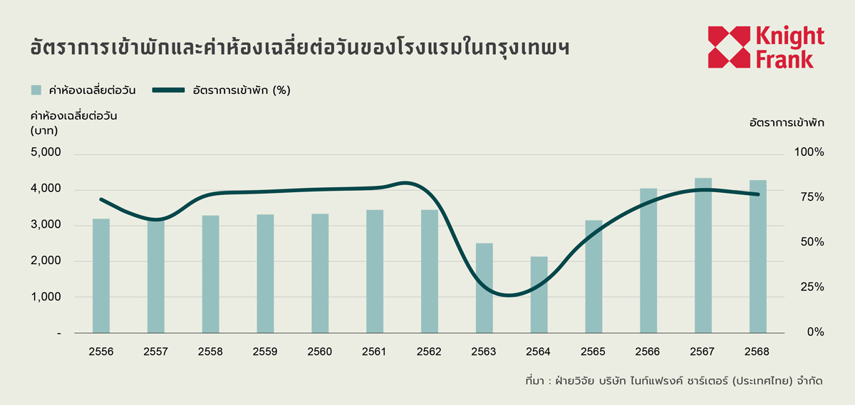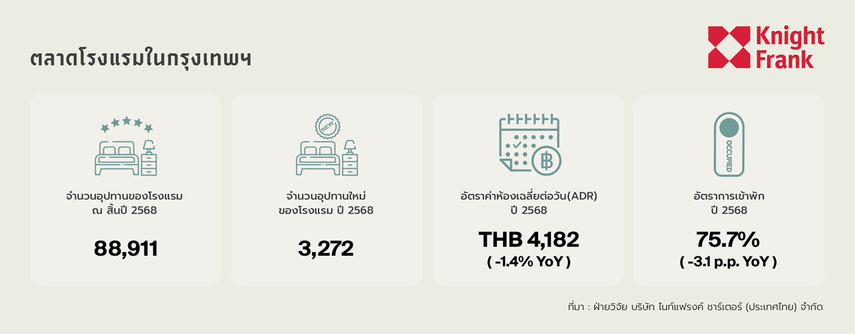 ไนท์แฟรงค์คาดว่า ปี 2569 ตลาดโรงแรมไทยจะยังคงเผชิญกับการแข่งขันที่เข้มข้นมากขึ้น โดยการเติบโตของอุปสงค์มีแนวโน้มเป็นไปอย่างค่อยเป็นค่อยไป ขณะที่อุปทานใหม่ยังคงเข้าสู่ตลาดต่อเนื่อง ส่งผลให้การเติบโตของรายได้ต่อห้องพัก (RevPAR) อยู่ในระดับจำกัด