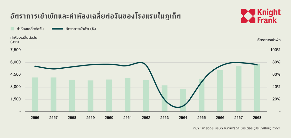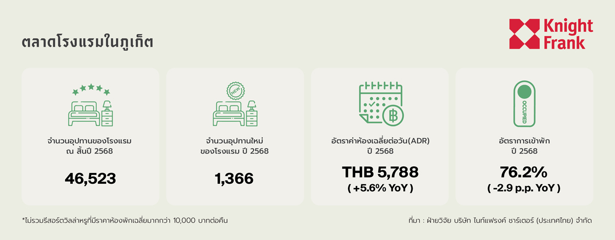 ในส่วนของภูเก็ต ภาคการท่องเที่ยวยังคงแสดงความยืดหยุ่น โดยจำนวนนักท่องเที่ยวต่างชาติที่เดินทางผ่านท่าอากาศยานเพิ่มขึ้น 2.2% เมื่อเทียบกับปีก่อนหน้า ขณะที่ตลาดโรงแรมยังคงเป็นตลาดที่ขับเคลื่อนด้วยอัตราค่าห้องพักเป็นหลัก (rate-led destination) อย่างไรก็ตาม อัตราการเข้าพักเฉลี่ยลดลงมาอยู่ที่ 76.2% ขณะที่ ADR เพิ่มขึ้นในอัตราที่ชะลอลง สะท้อนถึงการเริ่มปรากฏของเพดานราคา ท่ามกลางการแข่งขันจากทั้งอุปทานใหม่และจุดหมายปลายทางชายทะเลในภูมิภาค โดยในปี 2568 ภูเก็ตมีโรงแรมเปิดใหม่ 8 แห่ง เพิ่มห้องพักกว่า 1,300 ห้อง และยังมีอุปทานใหม่ใน pipeline อย่างต่อเนื่องในปี 2569