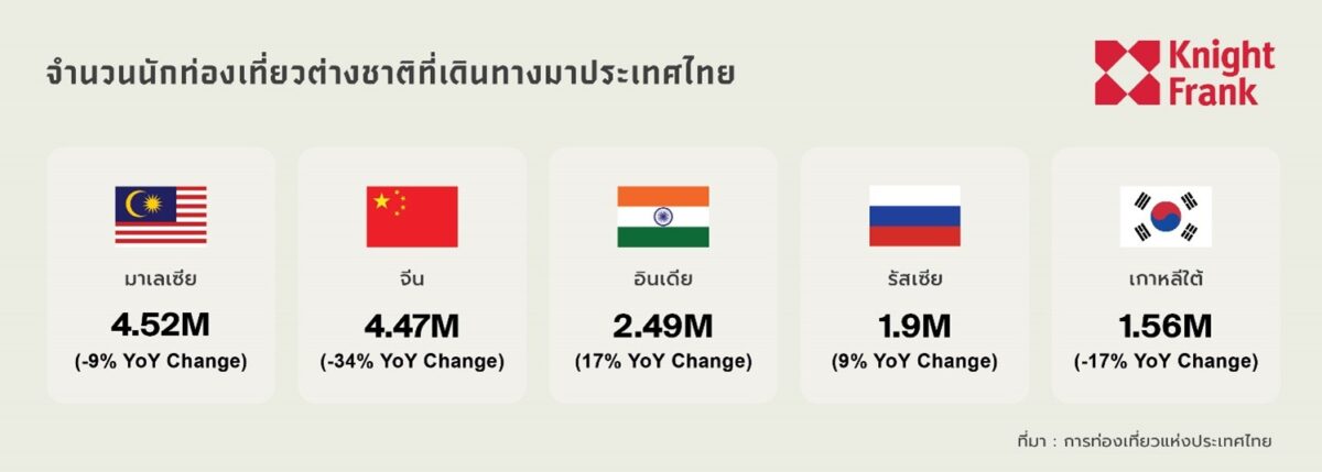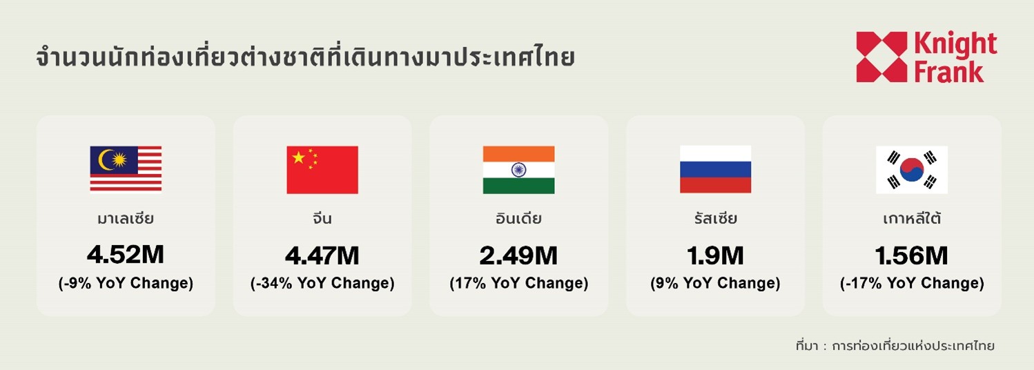 ในปี 2568 ประเทศไทยมีนักท่องเที่ยวต่างชาติรวม 32.97 ล้านคน ลดลง 7.2% เมื่อเทียบกับปีก่อนหน้า และคิดเป็นประมาณ 83% ของระดับสูงสุดก่อนโควิด-19 โดยโครงสร้างตลาดนักท่องเที่ยวมีการปรับสมดุลอย่างชัดเจน มาเลเซียก้าวขึ้นเป็นตลาดนักท่องเที่ยวขาเข้าที่ใหญ่ที่สุด ขณะที่จำนวนนักท่องเที่ยวจากจีนปรับตัวลดลงอย่างมีนัยสำคัญ ขณะที่อินเดียและรัสเซียยังคงเป็นตลาดที่เติบโต