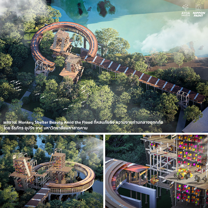 – สาขา Architectural รางวัลชนะเลิศ GOLD AWARD ได้แก่ ธีรภัทร อุปรัง จาก มหาวิทยาลัยมหาสารคาม กับผลงาน Monkey Shelter Beauty Amid the Flood ที่หลบภัยลิง ความงามท่ามกลางอุทกภัย นี้ได้แรงบันดาลใจจากปัญหาอุทกภัยที่วนอุทยานโกสัมพี จ.มหาสารคาม โครงการถูกออกแบบขึ้นเพื่อช่วยเหลือลิงแสมขนสีทองและลิงแสมขนสีเทารวมกว่า 700–800 ตัวที่ประสบปัญหาน้ำท่วมที่อยู่อาศัย และขาดแคลนอาหารในทุกๆ ฤดูฝนเพราะนักท่องเที่ยวไม่สามารถเข้าไปให้อาหารลิงได้ ที่หลบภัยดังกล่าวถูกออกแบบเป็นอาคารทรงกลม ยกพื้นสูงเพื่อรองรับสถานการณ์น้ำท่วม และดีไซน์ให้นักท่องเที่ยวส่งอาหารให้ลิงได้อย่างปลอดภัย