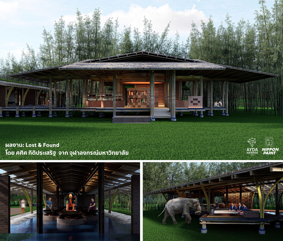 – สาขา Interior Design รางวัลชนะเลิศ GOLD AWARD ได้แก่ ศศิศ กิติประเสริฐ จาก จุฬาลงกรณ์มหาวิทยาลัย กับผลงาน Lost & Found โครงการพัฒนาพื้นที่เรียนรู้คน-ช้าง มุ่งยกระดับคุณภาพชีวิตของช้างและสร้างรายได้ที่ยั่งยืนแก่ควาญช้าง ผ่านการต่อยอด “มูลช้าง” เป็นวัสดุทดแทนและผลิตภัณฑ์สร้างสรรค์ เช่น แผ่นพื้น อิฐ กระดาษ และเฟอร์นิเจอร์ พื้นที่เลี้ยงช้างถูกออกแบบให้กลมกลืนธรรมชาติ เลือกใช้สีที่ช้างมองเห็นได้ชัดและวัสดุท้องถิ่นอย่างไม้ไผ่และงานจักสาน สะท้อนภูมิปัญญาชาวบ้าน เชื่อมความสัมพันธ์คนกับช้าง และเปิดโอกาสให้คนภายนอกเข้ามาเรียนรู้วิถีชีวิตชุมชน