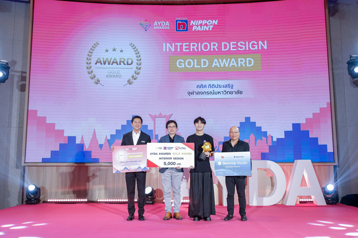 ผู้ชนะรางวัลชนะเลิศ GOLD AWARD บนเวที AYDA AWARDS 2025 ทั้ง 2 ท่าน แต่ละท่านจะได้รับเงินรางวัลมูลค่า 100,000 บาท, โปรแกรม SketchUp Education Studio 1 ปี, Gift Voucher จากไทวัสดุมูลค่า 5,000 บาท และได้สิทธิเป็นตัวแทนประเทศไทยเพื่อเข้าร่วมแข่งขัน AYDA Awards International Summit 2026 ซึ่งเป็นเวทีที่รวบรวมตัวแทนนักออกแบบรุ่นใหม่รวม 20 ประเทศเข้าประกวดเพื่อเฟ้นหาสุดยอดนักออกแบบที่เป็นที่สุดในระดับนานาชาติ ซึ่งผู้ชนะบนเวทีดังกล่าวจะได้เข้าอบรมในหลักสูตรพิเศษ Design Discovery Program ที่ Harvard’s Graduate School of Design ประเทศสหรัฐอเมริกา เป็นระยะเวลา 3 สัปดาห์ โดยไม่มีค่าใช้จ่าย ถือเป็นโอกาสครั้งยิ่งใหญ่ที่นักออกแบบต่างใฝ่ฝันและจะเปิดประตูในสายอาชีพให้กว้างขึ้นและมั่นคงยิ่งขึ้น นอกจากนี้ยังมีรางวัลสำหรับ Young Designers ผู้ผ่านเข้าสู่รอบสุดท้ายทั้ง 12 ท่านจาก 2 สาขาประกวด ได้รับรางวัล A5 Best Design และรางวัล Best Lecturer Award สำหรับอาจารย์ที่ปรึกษาที่ผลักดันนักศึกษาจนชนะรางวัล GOLD AWARD สำเร็จ จะได้รับรางวัลท่านละ 4,000 บาท และ SketchUp Education Lab เวลา 1 ปี จำนวน 15 ไลเซนส์ ซึ่งรางวัลนี้ตกเป็นของ ผศ.ดร.วรวรรณ เนตรพระ และ อ.สิรินทรา เอื้อศิริทรัพย์