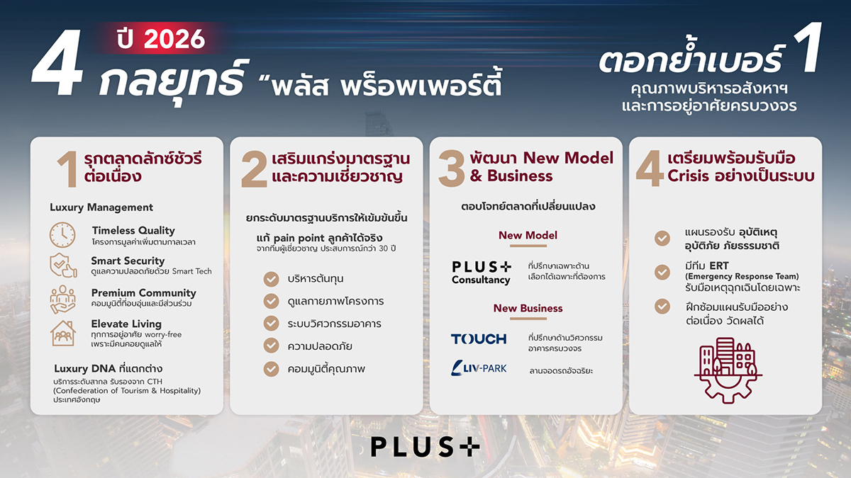 บริษัท พลัส พร็อพเพอร์ตี้ จำกัด ผู้นำอันดับหนึ่งด้านคุณภาพบริหารจัดการอสังหาริมทรัพย์และการอยู่อาศัยครบวงจร เปิดเผยวิสัยทัศน์และทิศทางธุรกิจปี 2569 ภายใต้แนวคิด “Moving Forward with Resilience” มุ่งยกระดับมาตรฐานบริการ ควบคู่การบริหารจัดการเชิงรุกท่ามกลางความท้าทายของตลาดอสังหาริมทรัพย์และภาวะเศรษฐกิจ