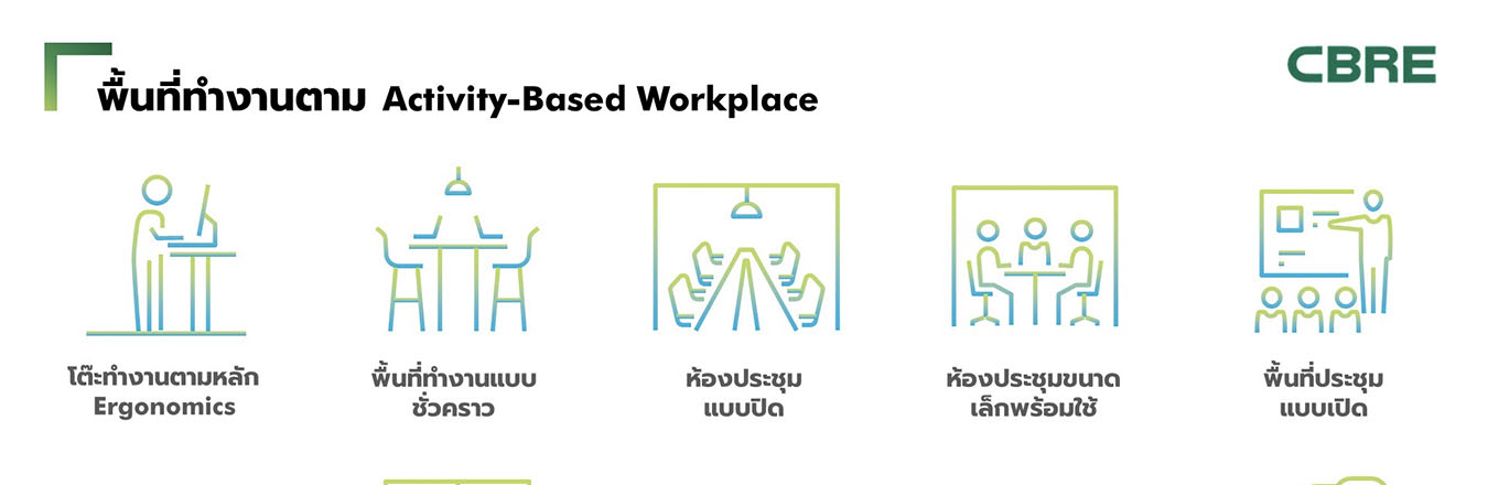ซีบีอาร์อี บริษัทที่ปรึกษาด้านอสังหาริมทรัพย์ชั้นนำระดับโลกเผยว่า ด้วยผลกระทบจากโควิด-19 จะทำให้สำนักงานเปลี่ยนไปในเรื่องการออกแบบพื้นที่และการใช้พื้นที่ นโยบายที่เกี่ยวกับพนักงาน ทัศนคติของผู้นำ และการประเมินผลการทำงาน ซึ่งจะเป็นปัจจัยที่เร่งให้ตลาดสำนักงานต้อง ‘ปรับเปลี่ยน’ จุดยืนที่มีต่อสภาพแวดล้อมการทำงานที่ยืดหยุ่นและสถานที่ทำงานที่เปลี่ยนไปตามลักษณะการทำงาน (Activity-Based Workplace) ที่จะแพร่หลายในอนาคต