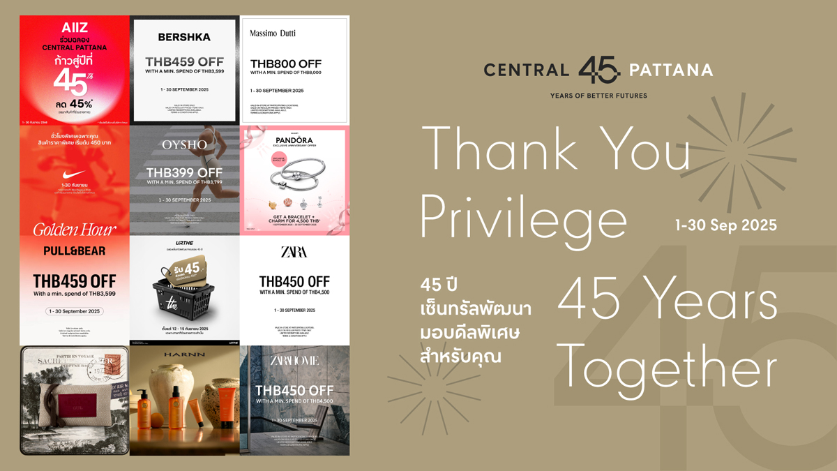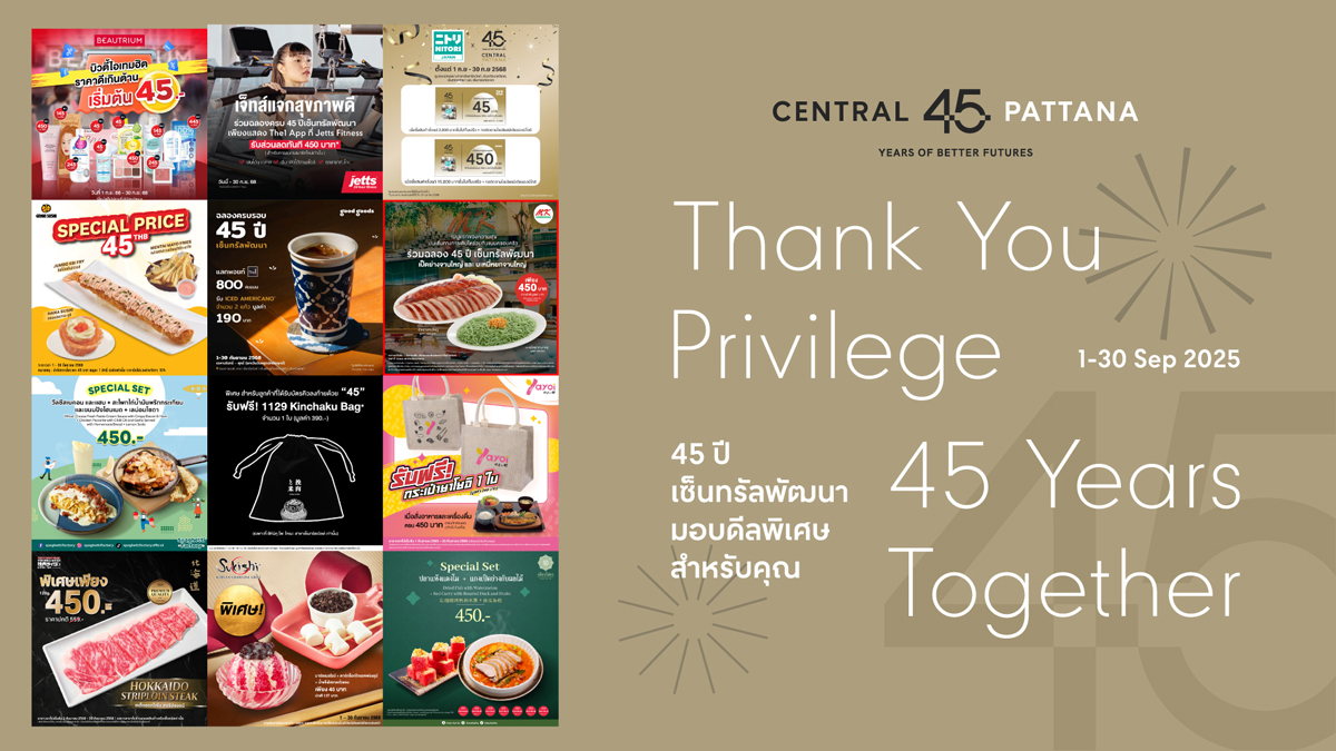 – ร่วมกับร้านค้าแบรนด์ดัง มอบโปรโมชันสุดพิเศษ ฉลอง 45 ปีเซ็นทรัลพัฒนา ตั้งแต่วันนี้ถึง 30 ก.ย. 68 อาทิ ส่วนลดสูงสุด 45% จากแบรนด์แฟชั่นและไลฟ์สไตล์ชั้นนำ, สิทธิพิเศษและเซ็ทเมนูสุดเอ็กซ์คลูซีฟจากร้านอาหาร, ของขวัญลิมิเต็ดเอดิชั่น และสิทธิพิเศษสำหรับสมาชิก The1 ที่ร้านพันธมิตร
