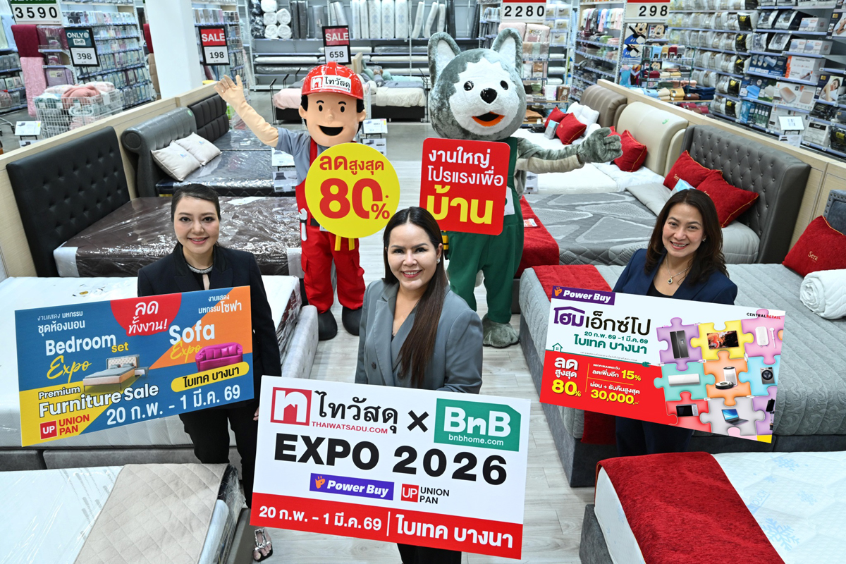 ไทวัสดุ และบีเอ็นบี โฮม ผู้นำธุรกิจค้าปลีกวัสดุก่อสร้างและสินค้าตกแต่งบ้าน ภายใต้ บริษัท ซีอาร์ซี ไทวัสดุ จำกัด ในเครือเซ็นทรัล รีเทล จัดมหกรรมสินค้าเพื่อบ้านที่ยิ่งใหญ่ที่สุดแห่งปี “ไทวัสดุ x บีเอ็นบี โฮม เอ็กซ์โป 2026” งานใหญ่โปรแรงเพื่อบ้าน มอบความคุ้มค่า ที่จะพาทุกคนไปค้นหาแรงบันดาลใจเพื่อสร้างสรรค์พื้นที่ที่ใช่สำหรับทุกคน พร้อมกระตุ้นดีมานด์ในช่วงไตรมาสแรกของปีให้คึกคักด้วยกองทัพสินค้าลดสูงสุด 80% ครอบคลุมทั้งวัสดุก่อสร้าง เครื่องมือช่าง เฟอร์นิเจอร์ สุขภัณฑ์ เครื่องใช้ไฟฟ้า และสินค้าไลฟ์สไตล์จากพันธมิตรแบรนด์ดัง พร้อมดีลสุดพิเศษเมื่อช้อปภายในงานครบทุก 10,000 บาท รับคูปองส่วนลดสูงสุด 34,000 บาท* และความคุ้มพิเศษ 5 ต่อ รวมทั้งรับสิทธิ์ลุ้นรางวัลใหญ่ อาทิ สร้อยคอทองคำ และบัตรกำนัล รวมมูลค่ากว่า 300,000 บาท พร้อมกันนี้ สมาชิก The 1 และบัตรเครดิต เซ็นทรัล เดอะวัน รับสิทธิพิเศษเหนือระดับ ทั้งส่วนลดและเครดิตเงินคืนรวมสูงสุดกว่า 30,000 บาท ขณะเดียวกันยังผนึกความคุ้มกับ เพาเวอร์บาย ที่นำเครื่องใช้ไฟฟ้าและสินค้าไอทีมาจัดรายการราคาพิเศษพร้อมรับคูปองส่วนลดมูลค่ารวมสูงสุด 4,300 บาท และ ยูเนี่ยนแพน (Union Pan) กับมหกรรม Premium Furniture Sale 2026 รวมแบรนด์เฟอร์นิเจอร์ระดับไฮเอนด์ครบทุกสไตล์ เติมเต็มความสุขตลอด 10 วันเต็ม ตั้งแต่วันที่ 20 กุมภาพันธ์ – 1 มีนาคม 2569 เวลา 10.00 – 22.00 น. ณ ไบเทค บางนา ฮอลล์ EH 101–104