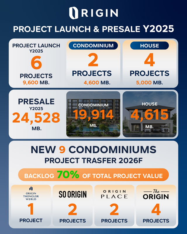 ออริจิ้น โชว์ยอดขายบ้าน-คอนโดฯ ปี 2568 กว่า 24,500 ล้านบาท ปี 2569 จ่อโอนคอนโดฯเพิ่มอีก 9 โครงการ ตุน Backlog แล้วกว่า 70% ของมูลค่าโครงการ