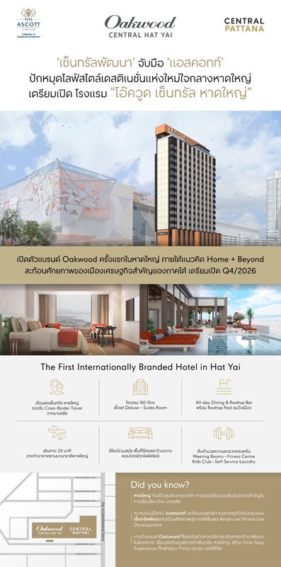 บริษัท เซ็นทรัลพัฒนา จำกัด (มหาชน) ผู้นำเบอร์หนึ่งอสังหาริมทรัพย์ไทยเพื่อความยั่งยืน พัฒนาและบริหารศูนย์การค้า, ที่อยู่อาศัย, โรงแรม และอาคารสำนักงานทั่วประเทศไทย ร่วมกับ ดิ แอสคอทท์ ลิมิเต็ด (แอสคอทท์) ผู้ให้บริการด้านที่พักและโรงแรมชั้นนำระดับโลก ภายใต้เครือ CapitaLand Investment (CLI) ประกาศพัฒนาโครงการ โรงแรมโอ๊ควูด เซ็นทรัล หาดใหญ่ (Oakwood Central Hat Yai) นับเป็นการเปิดตัวแบรนด์ Oakwood ครั้งแรกในหาดใหญ่ สะท้อนศักยภาพของเมืองเศรษฐกิจสำคัญของภาคใต้ และตอกย้ำการยกระดับมาตรฐานที่พักและการบริการ โดยโรงแรมตั้งอยู่ในทำเลศักยภาพ เชื่อมต่อโดยตรงกับศูนย์การค้าเซ็นทรัล หาดใหญ่ ศูนย์กลางไลฟ์สไตล์และแลนด์มาร์คสำคัญของเมือง โดยใช้เวลาเดินทางจากท่าอากาศยานนานาชาติหาดใหญ่เพียง 20 นาที ตอบโจทย์ทั้งการพักผ่อนและการใช้ชีวิตใจกลางเมืองได้อย่างสมบูรณ์แบบ พร้อมเตรียมเปิดให้บริการในไตรมาส 4 ปี 2569