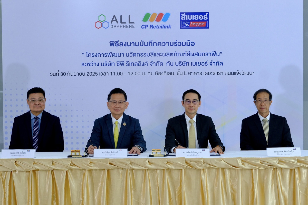 บริษัท เบเยอร์ จำกัด (Beger) ผู้นำด้านนวัตกรรมสีทาอาคารและเคมีภัณฑ์ก่อสร้างของไทย ร่วมกับ บริษัท ซีพี รีเทลลิงค์ จำกัด (CP Retailink) ผู้นำโซลูชันระบบค้าปลีกและผู้พัฒนาวัสดุกราฟีน ลงนามบันทึกข้อตกลงความร่วมมือทางวิชาการ (MOU) เพื่อพัฒนา “Graphene for Paint Technology” นวัตกรรมใหม่สำหรับสีรุ่นใหม่ที่ต่อยอดการใช้วัสดุกราฟีนในอุตสาหกรรมสีและเคมีภัณฑ์ก่อสร้าง ณ ห้องกิเลน ชั้น L เดอะ ธารา แจ้งวัฒนะ