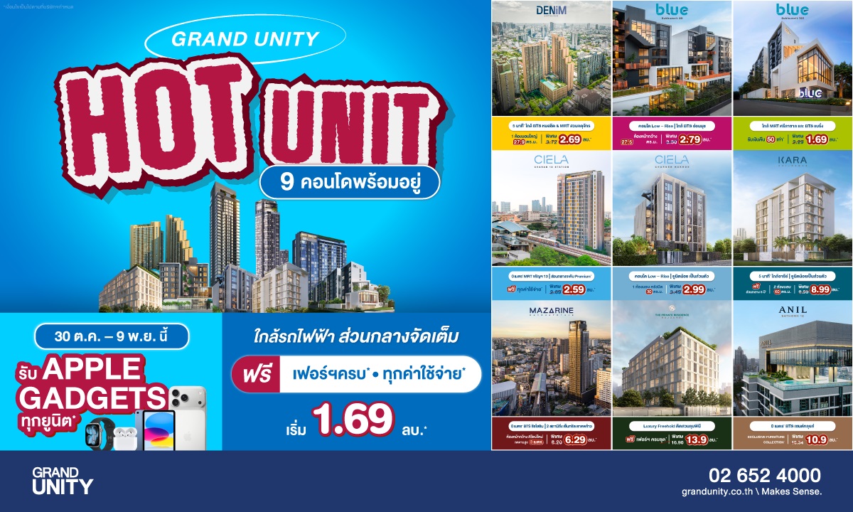 แกรนด์ ยูนิตี้ เดินหน้ากระตุ้นยอดขายช่วงโค้งสุดท้ายของปี จัดโปรโมชั่น “GRAND UNITY HOT UNIT ยูนิตราคาพิเศษ” กับ 9 คอนโดมิเนียมพร้อมอยู่ ใกล้รถไฟฟ้า บนทำเลศักยภาพทั่วกรุงเทพฯ พร้อมจับเทรนด์ดิจิทัลไลฟ์สไตล์ มอบ APPLE Gadgets ให้ทุกยูนิต* เริ่มต้นเพียง 1.69 ล้านบาท* ระหว่างวันที่ 30 ตุลาคม – 9 พฤศจิกายนนี้ เท่านั้น ที่สำนักงานขายทุกโครงการ