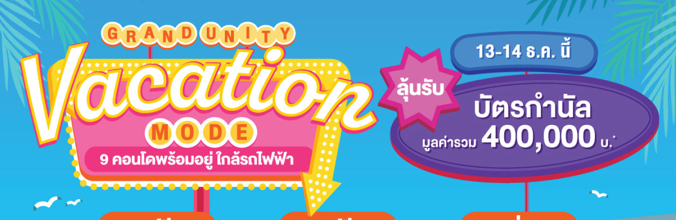 พบกับแคมเปญ “VACATION MODE” พร้อมรับข้อเสนอพิเศษส่งท้ายปีได้ ภายในงานวันที่ 13 – 14 ธันวาคมนี้ เท่านั้น ณ สำนักงานขายทุกโครงการของ แกรนด์ ยูนิตี้ สำหรับผู้ที่สนใจสามารถดูข้อมูลเพิ่มเติมได้ที่ www.grandunity.co.th หรือสอบถามรายละเอียดได้ที่ LINE @GrandUnity หรือโทร. 0 2652 4000