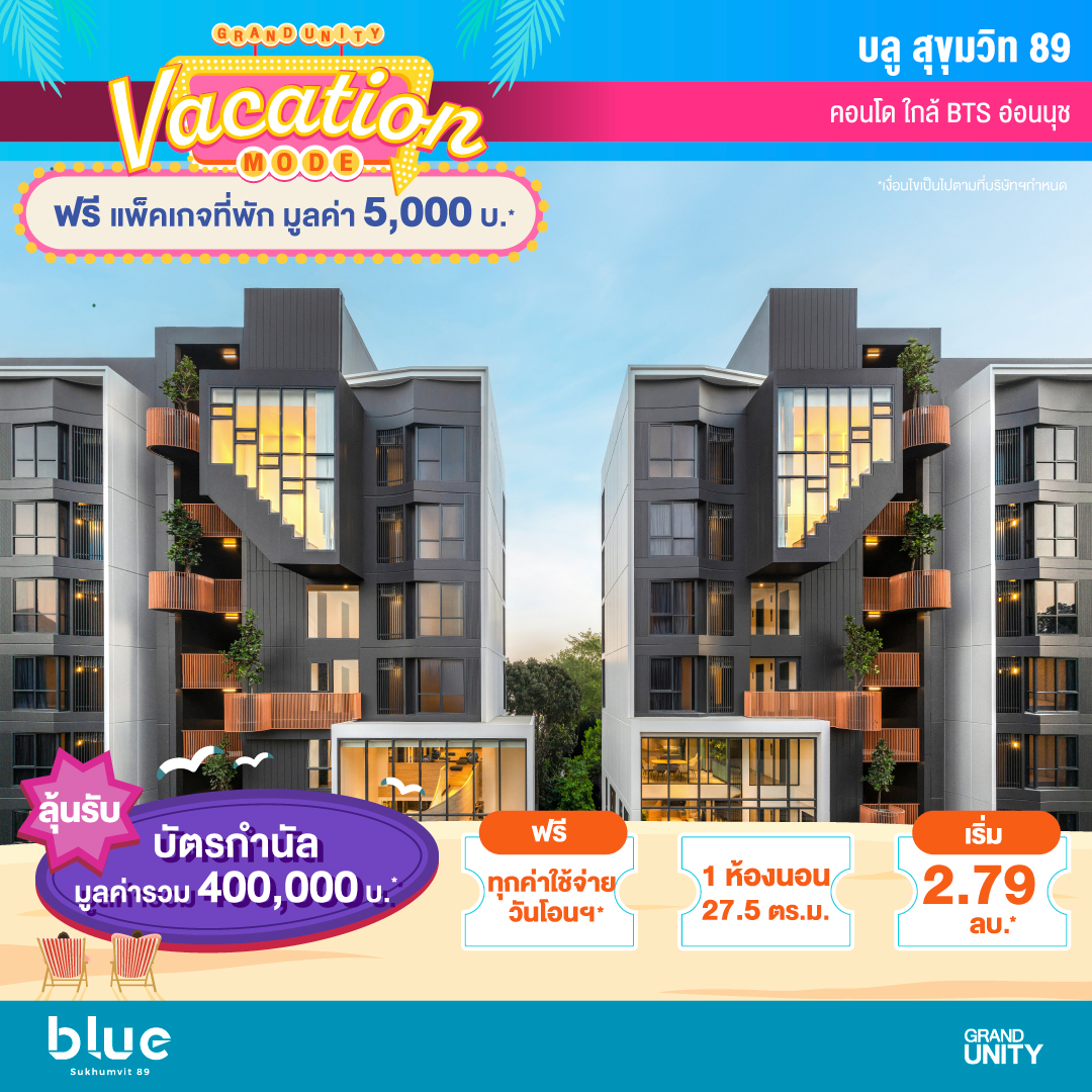 โครงการ บลู สุขุมวิท 89 (blue Sukhumvit 89) คอนโดมิเนียมโลว์ไรส์ ใกล้รถไฟฟ้า BTS สถานีอ่อนนุช พร้อมรับแพ็คเกจที่พัก มูลค่า 5,000 บาท* ฟรี ทุกค่าใช้จ่ายวันโอนฯ* ห้องหน้ากว้าง พร้อมเฟอร์นิเจอร์ครบ* ในราคาเริ่มต้น 2.79 ล้านบาท*