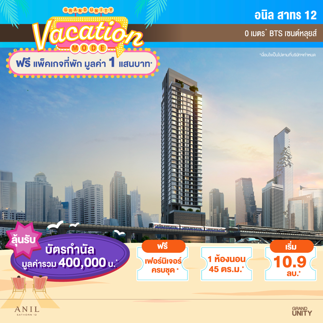 โครงการ อนิล สาทร 12 (ANIL Sathorn 12) คอนโดมิเนียมระดับซูเปอร์ลักซ์ชัวรี ทำเล CBD ใจกลางสาทร ติด BTS สถานีเซนต์หลุยส์ ระยะ 0 เมตร* พร้อมรับแพ็คเกจที่พัก มูลค่า 100,000 บาท* และฟรีเฟอร์นิเจอร์ครบชุด* 1 ห้องนอน ขนาด 45 ตร.ม. ในราคาเริ่มต้น 10.9 ล้านบาท*