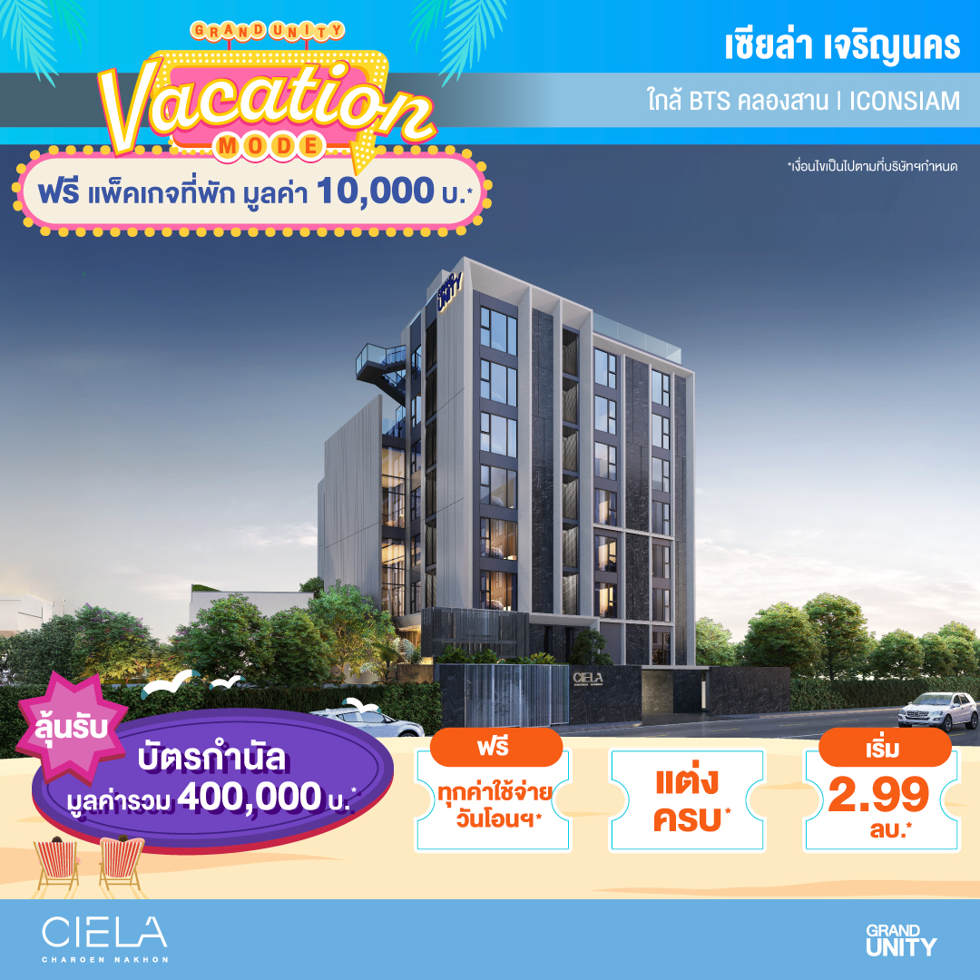 โครงการ เซียล่า เจริญนคร (CIELA Charoen Nakhon) คอนโดมิเนียมโลว์ไรส์พร้อมอยู่ ใกล้รถไฟฟ้า BTS สายสีทอง สถานีคลองสาน และใกล้ ICONSIAM รับแพ็คเกจที่พัก มูลค่า 10,000 บาท* ฟรี ทุกค่าใช้จ่ายวันโอนฯ* 1 ห้องนอน ครัวปิด ในราคาเริ่มต้น 2.99 ล้านบาท*
