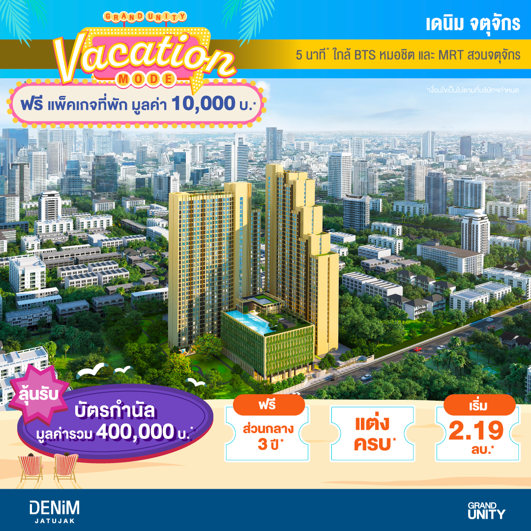 โครงการ เดนิม จตุจักร (DENIM Jatujak) คอนโดมิเนียมไลฟ์สไตล์ยุคใหม่ ใจกลางจตุจักร เพียง 5 นาที* ใกล้รถไฟฟ้า BTS สถานีหมอชิต และ MRT สถานีสวนจตุจักร พร้อมรับแพ็คเกจที่พัก มูลค่า 10,000 บาท* แต่งครบ* และฟรี ค่าส่วนกลาง 3 ปี* ในราคาเริ่มต้น 2.19 ล้านบาท*