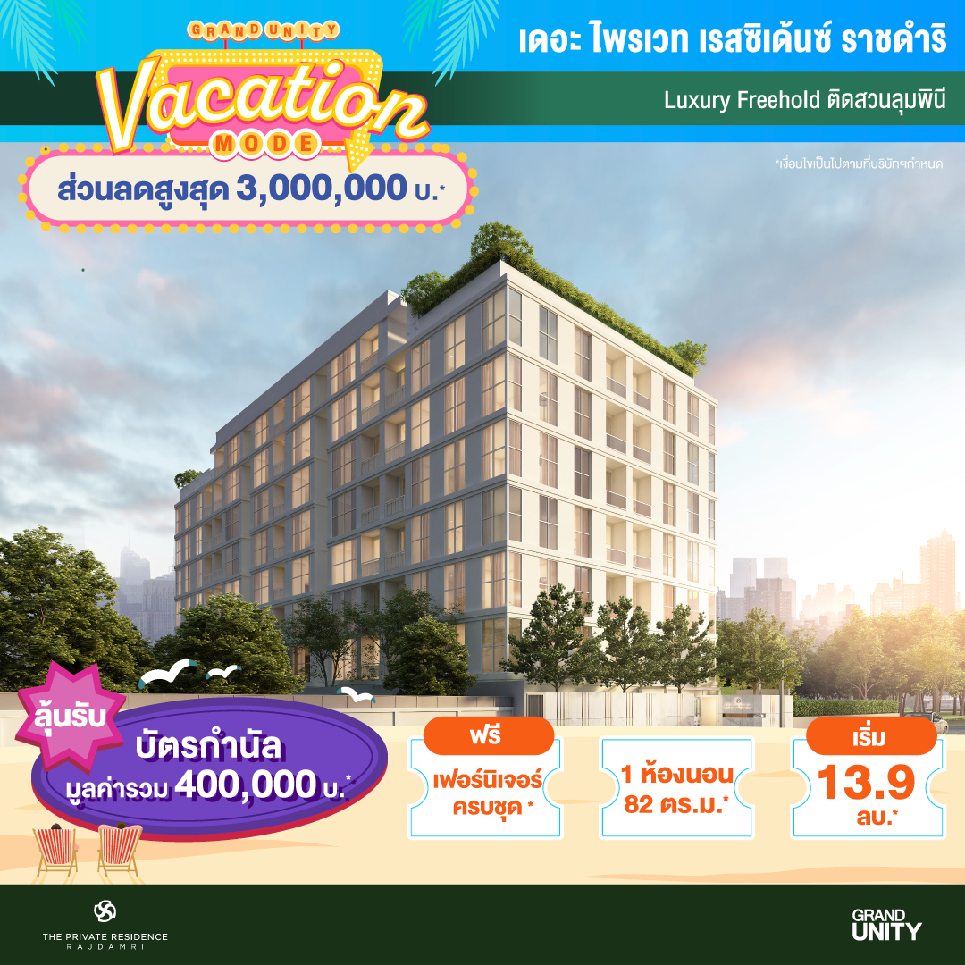 โครงการ เดอะ ไพรเวท เรสซิเด้นซ์ ราชดำริ (The Private Residence Rajdamri) คอนโดมิเนียมระดับลักซ์ชัวรี่ กรรมสิทธิ์แบบ Freehold ติดสวนลุมพินี และใกล้ One Bangkok พร้อมรับส่วนลดพิเศษสูงสุด 3,000,000 บาท* และฟรี เฟอร์นิเจอร์ครบชุด* 1 ห้องนอน ขนาดใหญ่ 82 ตร.ม. ในราคาเริ่มต้น 13.9 ล้านบาท*