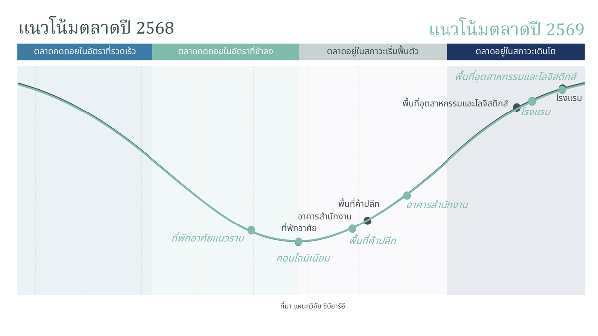 “ตลาดอสังหาริมทรัพย์ของไทยยังคงเปลี่ยนแปลงไปอย่างต่อเนื่อง ซึ่งหมายถึงผู้พัฒนาอสังหาริมทรัพย์ต้องวางแผนอย่างมีกลยุทธ์และมีความคล่องตัวในการลงทุนและพัฒนา” นางสาวรุ่งรัตน์ วีระภาคย์การุณ กรรมการผู้จัดการ ซีบีอาร์อี ประเทศไทย กล่าว “บทวิเคราะห์ของเราชี้ให้เห็นว่า แม้บางภาคธุรกิจจะยังคงเผชิญแรงกดดัน แต่บางภาคธุรกิจอยู่ในตำแหน่งที่พร้อมเติบโตได้อย่างแข็งแกร่ง โดยมีปัจจัยหนุนจากการปรับเปลี่ยนพฤติกรรมของผู้บริโภค มาตรการกระตุ้นจากภาครัฐ และทิศทางความเปลี่ยนแปลงระดับโลก ดังนั้น การปรับตัวและสร้างสรรค์สิ่งใหม่ ๆ จึงเป็นกุญแจสำคัญสู่ความสำเร็จ”