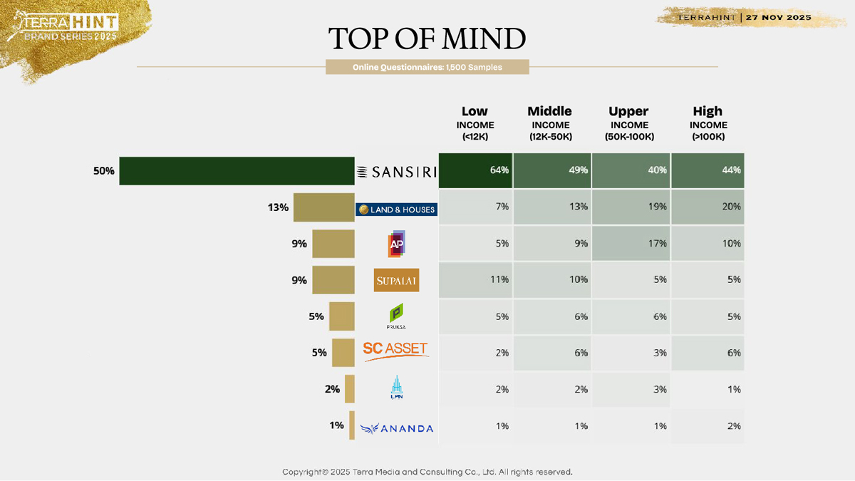 นับเป็นเครื่องยืนยันความสำเร็จ จากความมุ่งมั่นตลอด 40 ปีของแสนสิริ ในวิสัยทัศน์ที่มุ่งสู่การเป็น Top of Mind (ด้วยคะแนนรวม 50%) ที่มี Brand Awareness สูงเป็นอันดับหนึ่ง มาจากเสียงตอบรับของผู้บริโภคทั่วประเทศ