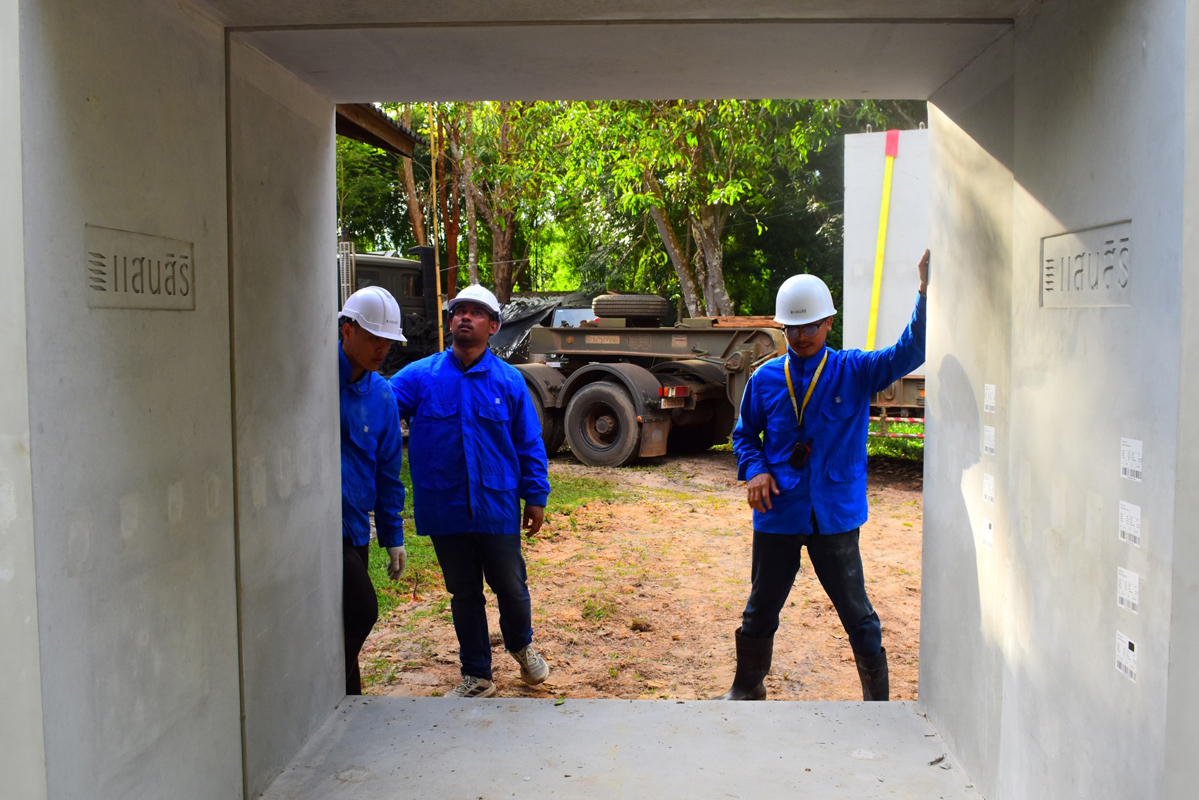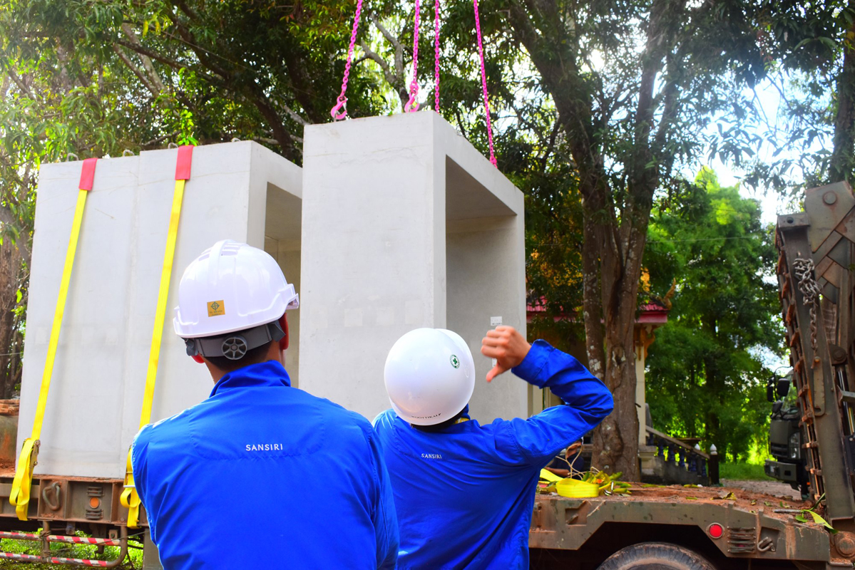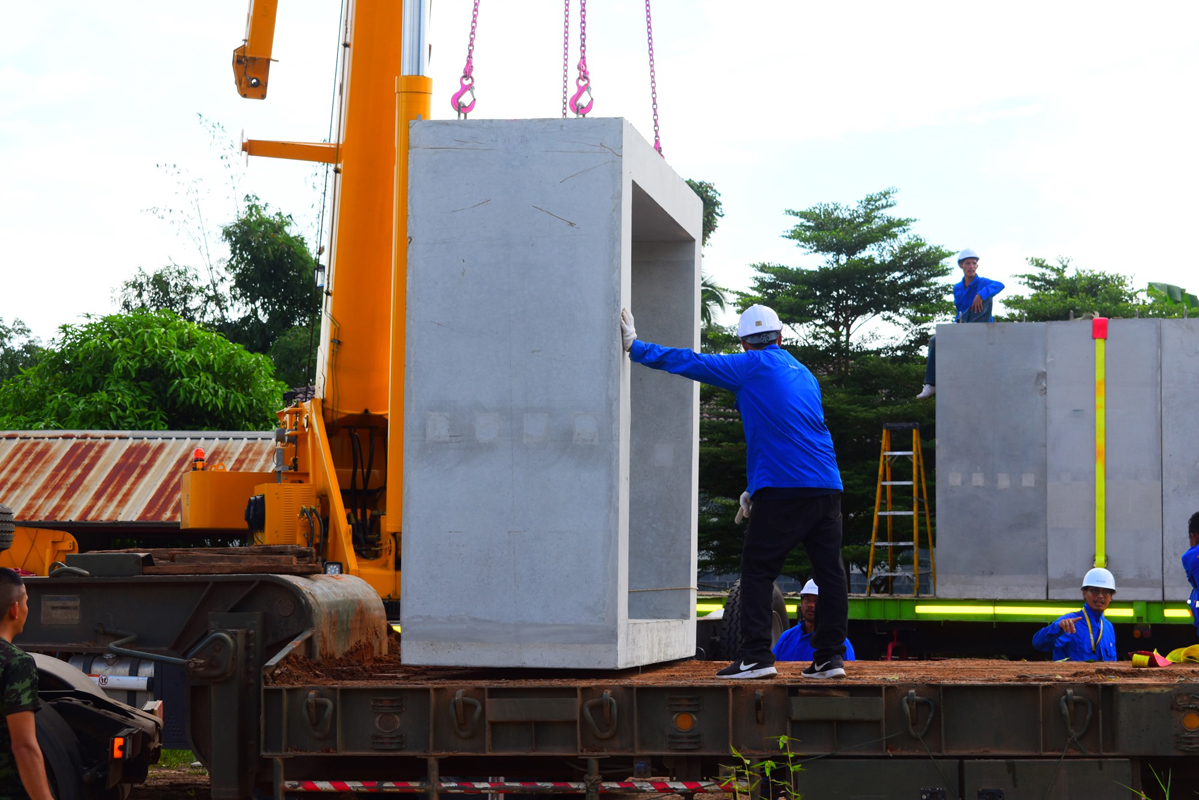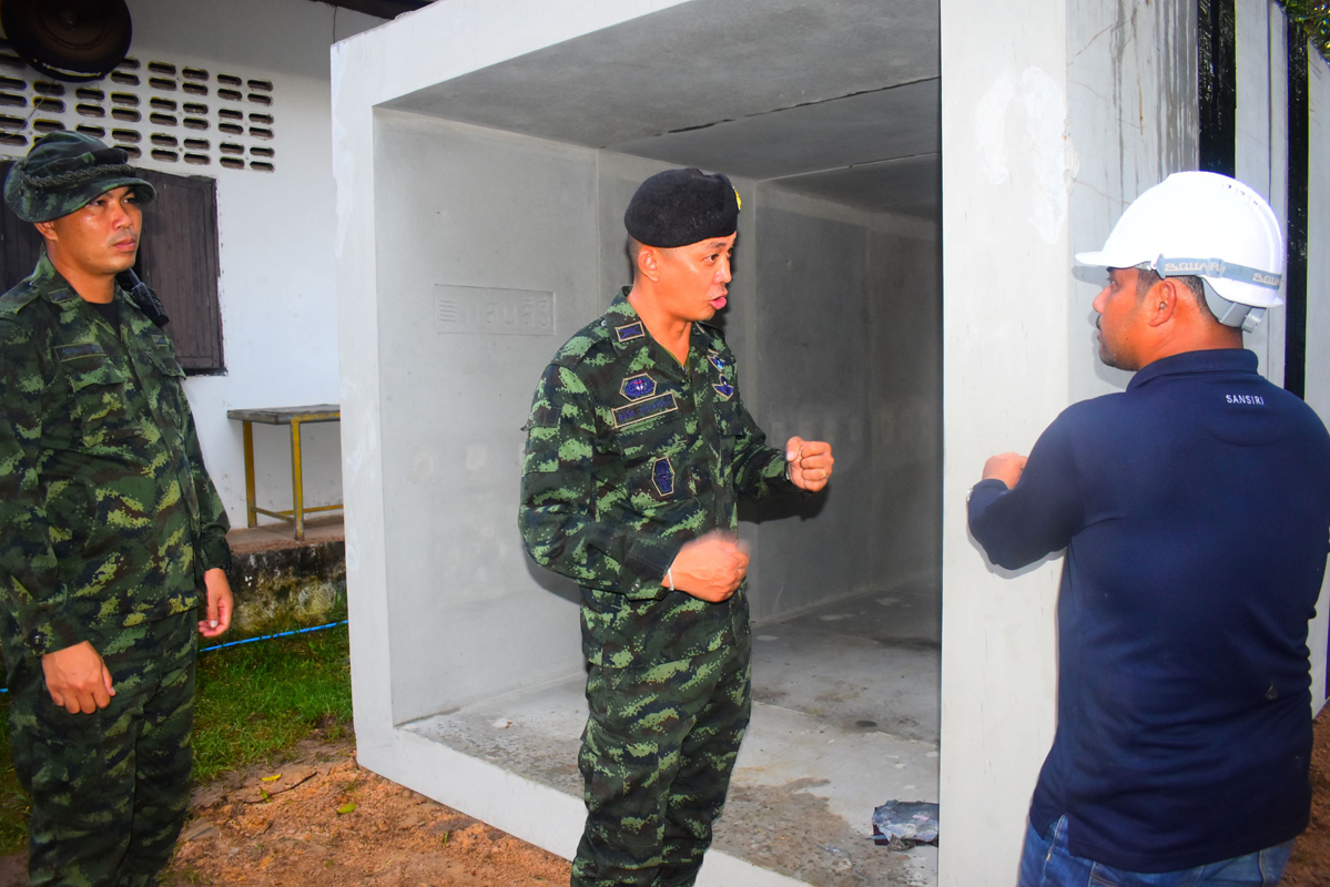 ภารกิจสำคัญครั้งนี้ สานต่อจากการลงพื้นที่ครั้งก่อน ทีมจิตอาสาแสนสิริและทีมติดตั้งจากโรงงานพรีคาสท์ ได้เร่งดำเนินการนำบังเกอร์ไปติดตั้งให้กับชุมชนในจังหวัดอุบลราชธานี โดยบังเกอร์ชุดนี้ไม่ได้เป็นเพียงที่กำบังทั่วไป แต่ถูกพัฒนาขึ้นด้วย เทคโนโลยีล่าสุดจากโรงงานพรีคาสท์ของแสนสิริ โดยใช้ “แผ่นกรีนพรีคาสท์ (Green Precast)” ซึ่งเป็นแผ่นคอนกรีตสำเร็จรูปเสริมเหล็กที่ถูกพัฒนาขึ้นเป็นพิเศษ ที่มีความทนทานต่อแรงกระแทกสูง ด้วยโครงสร้างที่แน่นหนาและเสริมเหล็กอย่างเป็นระบบ ทำให้สามารถรับมือกับแรงสั่นสะเทือนหรือแรงระเบิดในระยะไกลได้อย่างมีประสิทธิภาพ เป็นมิตรต่อสิ่งแวดล้อมและผู้ใช้งาน ช่วยลดอุณหภูมิความร้อนภายใน ทำให้ทหารสามารถปฏิบัติหน้าที่ได้อย่างสะดวกขึ้น และที่สำคัญคือความรวดเร็วในการติดตั้ง ด้วยระบบการเชื่อมต่อที่ออกแบบมาโดยเฉพาะ ทำให้การประกอบบังเกอร์ทั้งหมดนี้ใช้เวลาเพียงหนึ่งสัปดาห์ และในอนาคตยังสามารถปรับเปลี่ยนเป็นที่พักอาศัยหรือการใช้งานอื่นๆ ได้