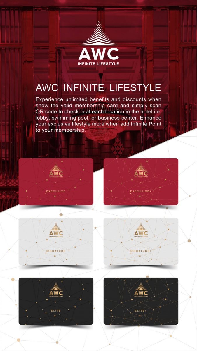 ออกแบบการใช้ชีวิตและการทำงานได้หลากหลายโครงการในเครือ AWC โดยร่วมเป็นส่วนหนึ่งกับ AWC Infinite Lifestyle ได้ทั้งรูปแบบ Executive, Signature หรือ Elite ซึ่งตอบโจทย์ประสบการณ์ใหม่ สร้างแรงบันดาลใจไร้ขีดจำกัด ความอิสระและยืดหยุ่นในการใช้ชีวิตทั้งการทำงานและการพักผ่อน (inspiring and flexible lifestyle) ที่รวบรวม “ออฟฟิศ – บ้าน – โรงแรม – ศูนย์การค้า” ไว้ในที่เดียวกันทั้งตารางการประชุมประจำวันและตารางการทำงาน ด้วยสินค้าและบริการที่ให้ความสำคัญสูงสุดในเรื่องสุขอนามัยความปลอดภัยและคุณภาพระดับพรีเมี่ยมจากทุกโครงการในเครือ AWC เริ่มต้นด้วยโรงแรม 16 แห่ง และจะขยายไปสู่อาคารสำนักงาน และศูนย์การค้าที่ตั้งในศูนย์กลางธุรกิจสำคัญของกรุงเทพฯ และเมืองท่องเที่ยวชั้นนำทั่วประเทศ