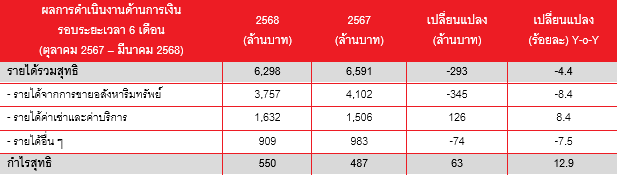 ในรอบ 6 เดือนแรกของปีงบการเงิน 2568 (ตุลาคม 2567 – มีนาคม 2568) เมื่อเทียบกับช่วงเวลาเดียวกันของปีก่อน บริษัทฯ มีรายได้ 6,298 ล้านบาท ลดลง 4.4% และมีกำไรสุทธิ 550 ล้านบาท เพิ่มขึ้น 12.9% ขณะที่ผลประกอบการของไตรมาส 2 ปีงบการเงิน 2568 (มกราคม – มีนาคม 2568) บริษัทฯ มีรายได้ 3,030 ล้านบาท จำนวนนี้เป็นรายได้จากการขายอสังหาริมทรัพย์ 1,754 ล้านบาท รายได้จากค่าเช่าและบริการ 836 ล้านบาท และรายได้อื่น ๆ 440 ล้านบาท โดยมีกำไรสุทธิ 221 ล้านบาท