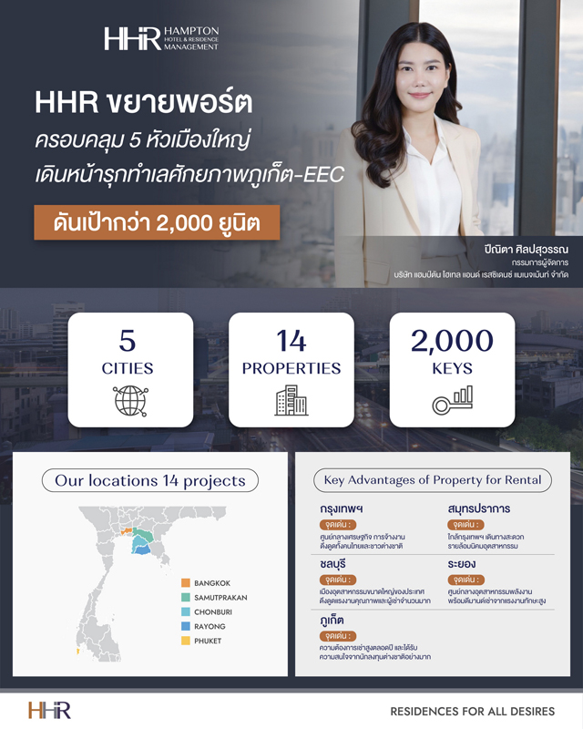 นางสาวปีณิตา ศิลปสุวรรณ กรรมการผู้จัดการ บริษัท แฮมป์ตัน โฮเทล แอนด์ เรสซิเดนซ์ แมเนจเม้นท์ จำกัด หรือ HHR กลุ่มธุรกิจบริหารจัดการอสังหาริมทรัพย์กลุ่มงาน Living Service ในเครือบริษัท พรีโม เซอร์วิส โซลูชั่น จำกัด (มหาชน) หรือ PRI เปิดเผยว่า HHR เป็นกลุ่มธุรกิจกลางน้ำ (Living Services) ที่ให้บริการที่เกี่ยวกับการอยู่อาศัยและการใช้ชีวิตหลังจากโครงการแล้วเสร็จ โดยเฉพาะการให้บริหารจัดการ Residential Property และ Service Apartment ปัจจุบัน HHR ได้ขยายพอร์ตโฟลิโอเดิมที่รับบริหารอยู่ 10 โครงการ เพิ่มเป็น 14 โครงการในไตรมาส 1/2569 นี้ ทำให้มีจำนวนห้องพักรวมกว่า 2,000 ยูนิต ครอบคลุม 5 เมืองใหญ่ในพื้นที่เศรษฐกิจและการท่องเที่ยวเที่ยวทั้งในกรุงเทพฯ, สมุทรปราการ, ชลบุรี, ระยอง และภูเก็ต