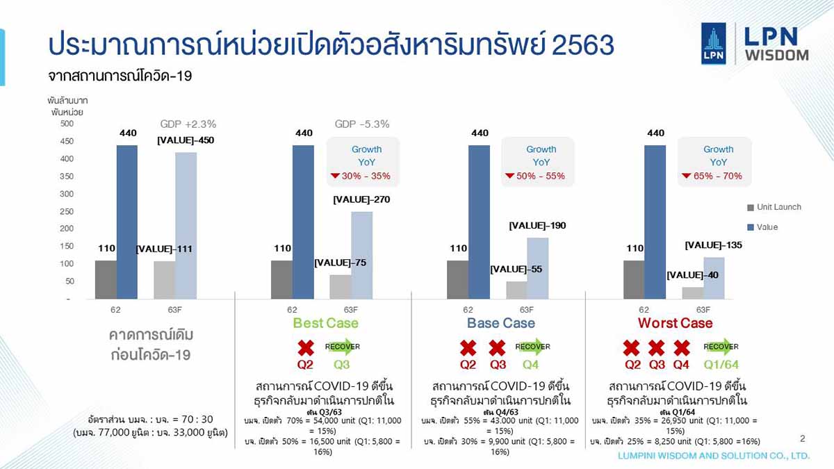 นายประพันธ์ศักดิ์ รักษ์ไชยวรรณ กรรมการผู้จัดการ บริษัท ลุมพีนี วิสดอม แอนด์ โซลูชั่น จำกัด (LPN Wisdom) บริษัทวิจัยและพัฒนาอสังหาริมทรัพย์ในเครือ แอล.พี.เอ็น.ดีเวลลอปเมนท์ กรุ๊ป กล่าวว่า การแพร่ระบาดของไวรัสโควิด-19 ตั้งแต่เดือนมกราคมจนถึงปัจจุบัน ส่งผลกระทบโดยตรงต่อการเติบโตของเศรษฐกิจของประเทศ โดยล่าสุดธนาคารแห่งประเทศไทยได้มีการปรับประมาณการณ์การเติบโตของเศรษฐกิจไทยจากที่คาดว่าจะเติบโตในอัตราร้อยละ 2.8 ลงมาอยู่ที่ติดลบร้อยละ 5.3 (ยังไม่รวมมาตรการกระตุ้นเศรษฐกิจของภาครัฐที่จะออกมา)