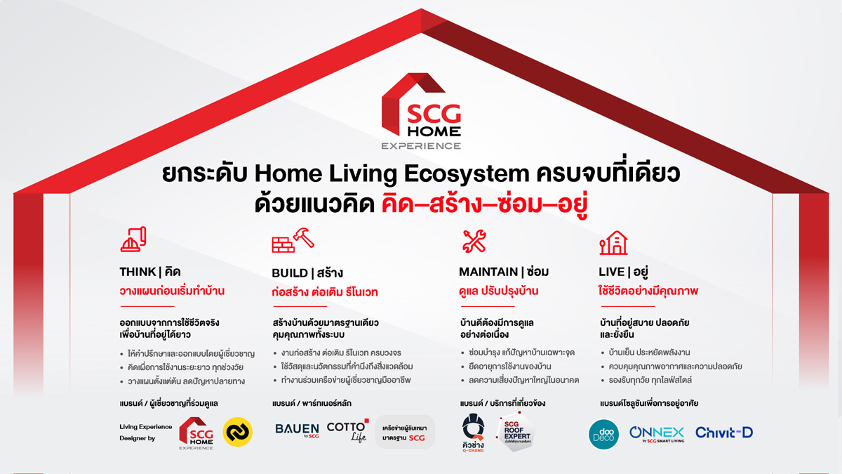 แนวคิด “คิด–สร้าง–ซ่อม–อยู่” ของ SCG HOME Experience ถูกพัฒนาขึ้นจากความเข้าใจว่าบ้านไม่ใช่เพียงที่อยู่อาศัย แต่เป็นสินทรัพย์ระยะยาวที่ต้องการการวางแผน ดูแล และปรับปรุงอย่างต่อเนื่อง SCG HOME Experience จึงพัฒนา Home Living Ecosystem ที่เชื่อมต่อทุกขั้นตอนของการทำบ้านเข้าด้วยกันอย่างเป็นระบบ ตั้งแต่การให้คำปรึกษาและออกแบบ การคัดสรรวัสดุและนวัตกรรมที่เหมาะสม การก่อสร้างและติดตั้งโดยผู้เชี่ยวชาญ ไปจนถึงการดูแลและซ่อมบำรุงในระยะยาว โดยให้ความสำคัญกับ มาตรฐานการให้บริการเดียวกันตลอดทั้งกระบวนการ ตั้งแต่ต้นน้ำถึงปลายน้ำ ทั้งการคัดเลือกสินค้า การทำงานร่วมกับเครือข่ายผู้เชี่ยวชาญ การตรวจสอบหน้างาน ไปจนถึงการส่งมอบงาน เพื่อสร้างความมั่นใจให้เจ้าของบ้านในด้านคุณภาพ ความปลอดภัย และความคุ้มค่าในระยะยาว