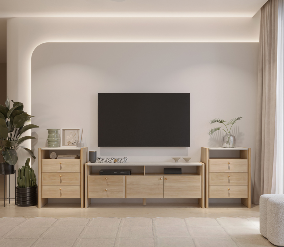 งานออกแบบด้วยเส้นสายโค้งมนที่เพิ่มเข้าไปในทุกรายละเอียดด้วยความใส่ใจ อย่าเช่น ท๊อปหินที่โค้งมน โครงตู้ และหน้าบานที่โค้งสอดรับกันอย่างพอดี หรือ Relaxed Form มีบทบาทสำคัญในการสร้างบรรยากาศที่นุ่มนวล โดยช่วยให้แสงไหลไปตามพื้นผิวของเฟอร์นิเจอร์อย่างเป็นธรรมชาติ ลดความแข็งกระด้างของเงา และสร้างอารมณ์สงบ ผ่อนคลาย เสริมด้วยโทนสี Earth Tone อย่างครีม เบจ และน้ำตาล ที่ทำงานร่วมกับแสงได้อย่างลงตัว ทั้งในแสงธรรมชาติยามเช้าและแสงไฟโทนอุ่นในยามค่ำคืน ขณะที่รายละเอียดของมือจับทองเหลืองทรงโค้ง ช่วยสะท้อนแสงเงาอย่างพอดี และช่วยเพิ่มความแตกต่างอีกทั้งยังช่วยผสานให้เกิดความสมบูรณ์แบบมากยิ่งขึ้น