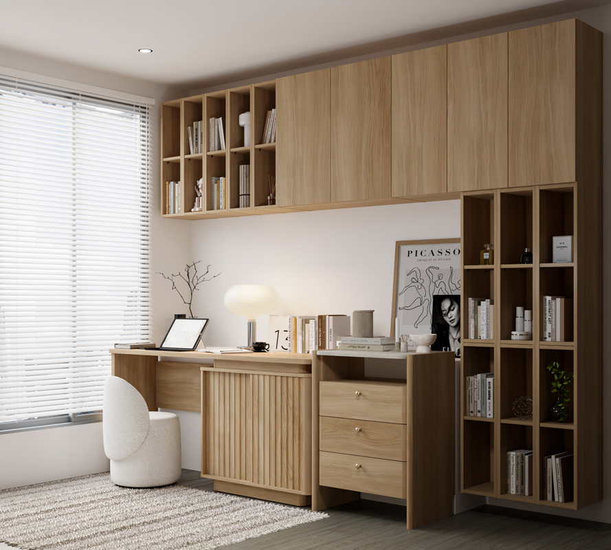 หัวใจของ Velin Collection อยู่ที่การออกแบบที่เปิดพื้นที่ให้วัสดุ แสง และเงาได้ทำงานร่วมกันอย่างเป็นธรรมชาติ ลายไม้ Valley Oak ถูกเลือกมาเพื่อเผยเสน่ห์ของผิวสัมผัสและลวดลายไม้ที่ดูอบอุ่น ซึ่งเมื่อแสงตกกระทบในช่วงเวลาต่าง ๆ ของวัน จะก่อให้เกิดเงาที่ไล่ระดับอย่างนุ่มนวล ช่วยขับมิติของลายไม้ให้ดูมีชีวิต และสะท้อนความงามที่ไม่ตายตัว อันเป็นเอกลักษณ์ของแนวคิด Wabi-Sabi ขณะเดียวกัน หน้าท็อปลายหิน Travertine ที่มีลวดลายเฉพาะตัว ก็ถ่ายทอดแนวคิด Imperfect Beauty ได้อย่างชัดเจน โดยแสงและเงาที่ตกกระทบบนพื้นผิวหิน จะช่วยเผยรายละเอียดของ texture และร่องรอยแห่งธรรมชาติอย่างละเมียด ทำให้ทุกมุมมองของเฟอร์นิเจอร์เปลี่ยนแปลงไปตามจังหวะของแสง สร้างบรรยากาศสงบ อบอุ่น และมีชีวิตชีวาในแบบ Modern Wabi-Sabi อย่างแท้จริง