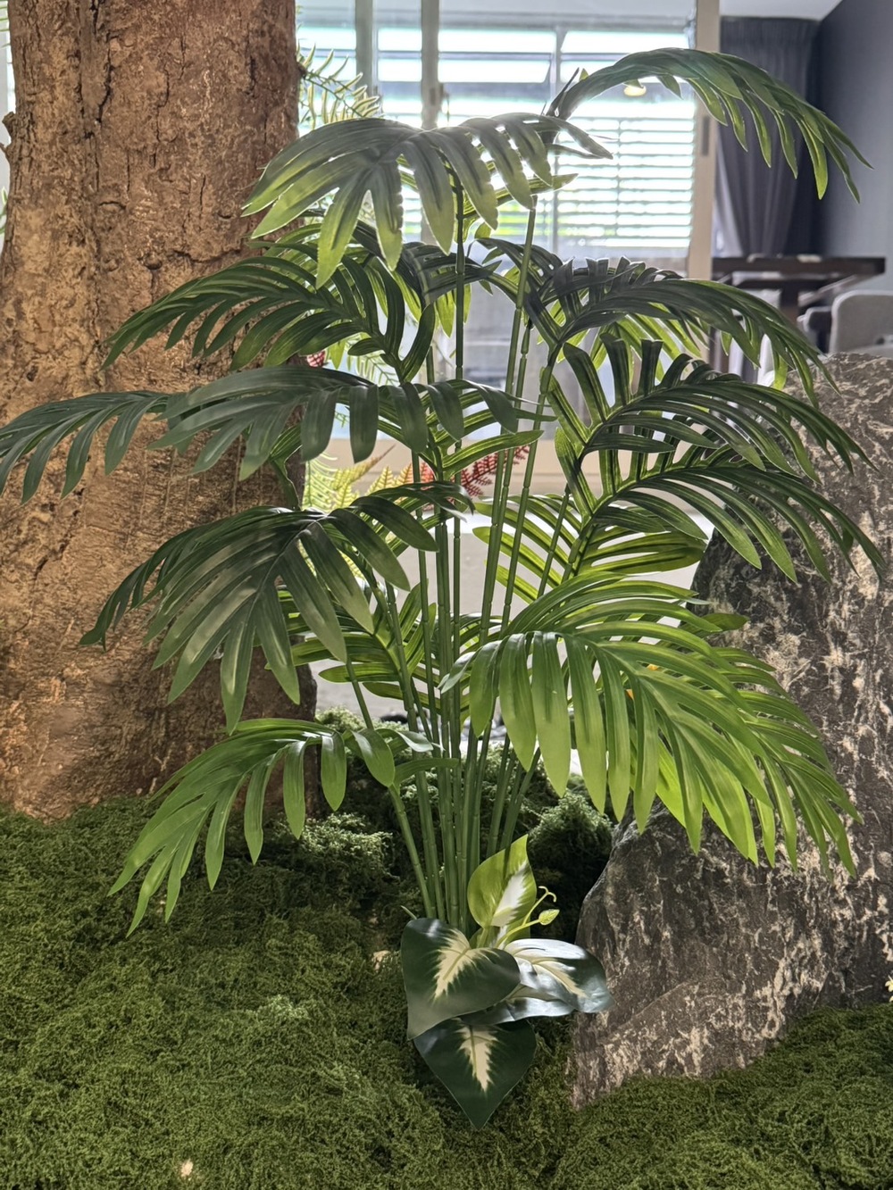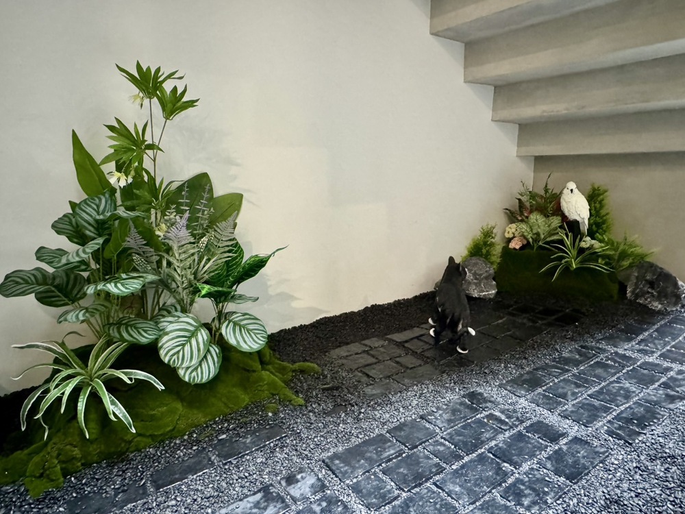 หลังจากที่เราเอาก้อนโฟม และฉีดโฟม PU เพื่อสร้างเป็นฐานแล้ว ก็เริ่มเอาสารพัดต้นไม้ประดิษฐ์มาปัก ตามตำแหน่งที่ต้องการ และก็เอามอสเทียมมาโรยให้ทั่ว ในส่วนนี้เราสามารถเอาต้นไม้ที่ชอบมาปักได้ตามต้องการ ใครชอบต้นอะไรก็ใส่ให้เต็มที่ เพราะการจัดสวนมันอยู่ที่ความชอบของแต่ละคน ชอบอันไหนก็ใส่ลงไปเลย