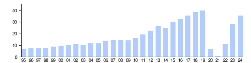 จำนวนนักท่องเที่ยวที่มาเยือนในแต่ละปีเป็น (หน่วย: ล้านคน)
