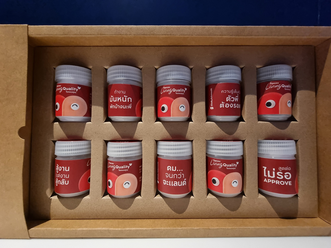 ความน่าสนใจอีกอย่างคือ AP เขาไม่ได้แค่สนับสนุนยาดมธรรมดา แต่ยังมีข้อความสั้นๆ อยู่บนฉลากแต่ละชิ้น กลายเป็นเหมือนกำลังใจที่พอดิบพอดีกับสถานการณ์ธุรกิจการงานตอนนี้ เช่น