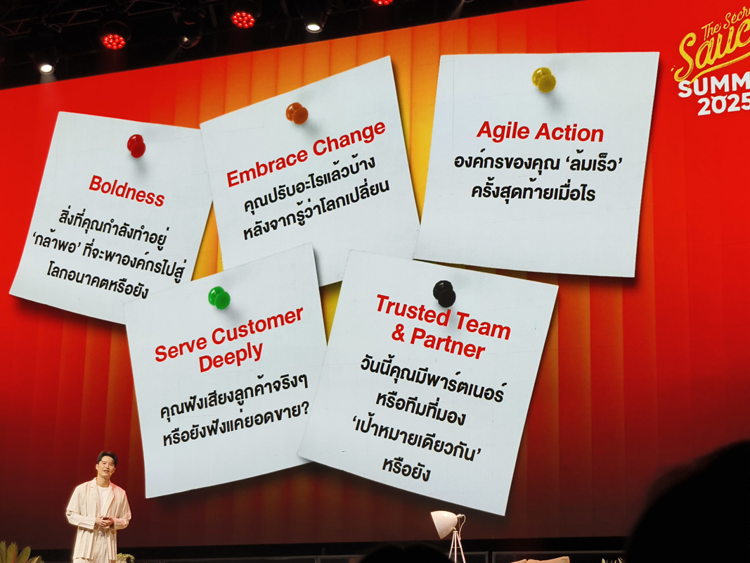 คุณเคน นครินทร์ วนกิจไพบูลย์ ประธานเจ้าหน้าที่บริหาร และบรรณาธิการบริหารของสำนักข่าวออนไลน์The Standard ผู้จัดงาน The Secret Sauce Summit 2025 ยังย้ำประเด็นสำคัญว่า ธุรกิจยุคนี้มันไม่ง่าย เสมือนเราเป็นแมวน้อยที่ต้องเพิ่มเขี้ยวเล็บในป่าใหญ่ต้องเอาตัวรอดให้ได้ ดังนั้นสิ่งที่ต้องมีคือ “สติ” และ “การลงมือทำจริง” ถ้ารู้ว่าต้องปรับ แต่ไม่เปลี่ยน มันก็ไม่เกิดอะไรขึ้น พูดง่ายๆ คือต้อง “ลองเร็ว ล้มเร็ว” แบบ agile ไม่ใช่มัวแต่คิดแล้วไม่ทำ หรือทำนะ แต่ทำช้าเกินไปจนเรียกว่าสายไปแล้ว