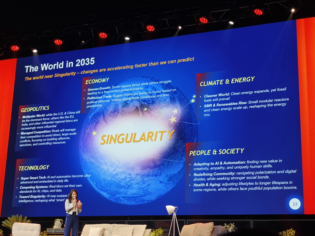 และเมื่อมองไปไกลถึงอีก10 ปีข้างหน้า ในปี 2035 ทางคุณจรีพร WHA คาดการณ์ว่าโลกจะเข้าสู่จุดเปลี่ยนที่เรียกว่า Singularity หรือ “ภาวะเอกฐานทางเทคโนโลยี” หมายถึงจังหวะเวลาที่ AI ก้าวล้ำจนเหนือกว่าความสามารถของมนุษย์ การเปลี่ยนแปลงจะไม่ใช่ค่อยเป็นค่อยไป แต่จะพุ่งทะยานอย่างรวดเร็วจนเกินที่เราในปัจจุบันจะคาดเดาผลลัพธ์ของมันได้