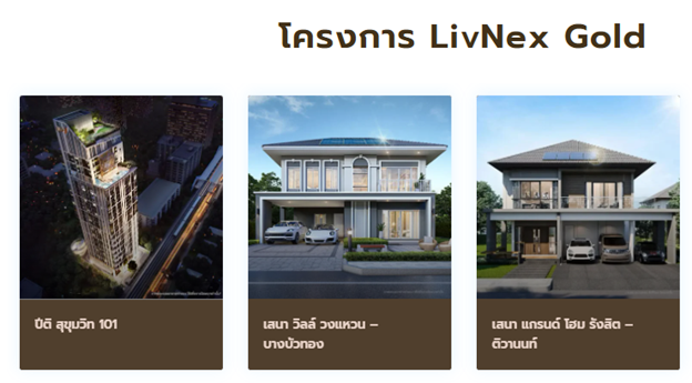 โครงการที่เข้าร่วมกับ LivNex Gold ล้วนเป็นโครงการคุณภาพจาก SENA Development ไม่ว่าจะเป็น PITI สุขุมวิท 101 คอนโดหรูใจกลางสุขุมวิทที่รายล้อมด้วยความสะดวกสบายของเมืองใหญ่, SENA Grand Home รังสิต–ติวานนท์ บ้านเดี่ยวบนทำเลแห่งศักยภาพ และ SENA Parkville รามอินทรา กม.9 ที่มอบบรรยากาศรีสอร์ทในย่านพักอาศัยยอดนิยม ทั้งหมดนี้สะท้อนแนวคิดของแบรนด์ SENA ที่ไม่เพียงสร้างบ้าน แต่สร้างคุณภาพชีวิตที่ยกระดับไปพร้อมกับโอกาสทางการเงินที่มั่นคง