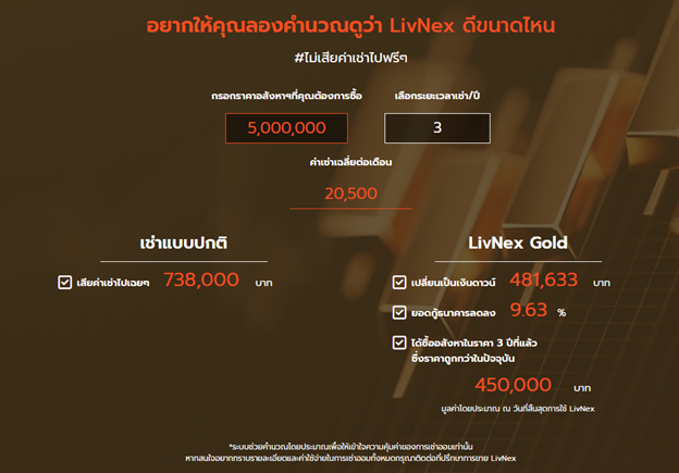 สิ่งที่ทำให้ LivNex Gold แตกต่าง คือเงื่อนไขที่เป็นมิตรกับผู้บริโภคมากกว่าสินเชื่อทั่วไป ด้วยอัตราดอกเบี้ยคงที่เพียง 1.8% ต่อปี ซึ่งต่ำกว่าดอกเบี้ยธนาคาร และผ่อนเริ่มต้นเพียงล้านละ 4,100 บาท ผู้เข้าร่วมโปรแกรมยังได้รับสิทธิ์ล็อกราคาซื้อทรัพย์ไว้ล่วงหน้าเป็นเวลา 12 เดือน และสามารถทำสัญญาได้ยาวสูงสุดถึง 36 เดือน ทำให้สามารถซื้อในราคาวันนี้ได้ แม้ว่าราคาตลาดจะปรับสูงขึ้นตามอัตราเงินเฟ้อในอนาคต ขณะเดียวกัน สัญญาเช่าออมนี้ยังเปิดโอกาสให้โอนสิทธิ์เปลี่ยนมือได้ จึงเหมาะทั้งสำหรับผู้ที่อยากมีบ้านและนักลงทุนที่มองหาทางเลือกการถือครองทรัพย์แบบใหม่