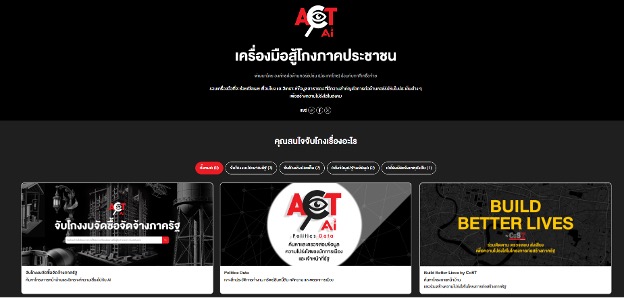 ขอแนะนำเว็บไซต์ ACT Ai https://actai.co/ พัฒนาโดย องค์กรต่อต้านคอร์รัปชัน (ประเทศไทย) (Anti-Corruption Organization of Thailand) http://www.anticorruption.in.th/ ร่วมกับภาคีเครือข่าย โดยรวบรวม “ข้อมูลเปิดภาครัฐ” https://data.go.th/ ที่สำคัญต่อการต่อต้านการทุจริต และทำให้คนทั่วไปสามารถเข้าถึง ตรวจสอบ และร้องเรียนได้อย่างสะดวก