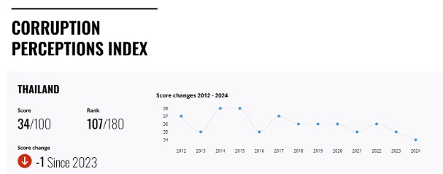 ประเทศไทยร่วงลงมาอยู่อันดับที่ 107 ของโลก จากรายงาน ดัชนีการรับรู้การทุจริต (Corruption Perceptions Index หรือ CPI) ปี 2024 โดยองค์กร Transparency International ประเทศไทยได้คะแนน 34 คะแนนจาก 100 ลดลง 1 คะแนนจากปีก่อน ซึ่งสะท้อนว่าระดับการรับรู้เรื่องคอร์รัปชันในภาครัฐยังอยู่ในระดับสูง แม้บางด้านจะมีพัฒนาการดีขึ้นก็ตาม ในกลุ่มอาเซียน ไทยอยู่อันดับที่ 5 รองจากสิงคโปร์ มาเลเซีย เวียดนาม และอินโดนีเซีย โดยผู้ช่วยเลขาธิการคณะกรรมการป้องกันและปราบปรามการทุจริตแห่งชาติ (ป.ป.ช.) https://www.nacc.go.th/ ชี้ว่า การลดลงของคะแนนมาจากความเห็นของผู้ประเมินที่มองว่า ภาครัฐยังขาดความโปร่งใสในการใช้งบประมาณ เช่น นโยบายประชานิยมที่ไม่คุ้มค่า การใช้งบเพื่อประโยชน์ส่วนตัว และการบริหารทรัพยากรสาธารณะที่ไม่มีประสิทธิภาพ ซึ่งปัญหาเหล่านี้ไม่เพียงบั่นทอนความเชื่อมั่นของประชาชน แต่ยังส่งผลต่อภาพลักษณ์ของประเทศในสายตานักลงทุนทั่วโลกด้วย.