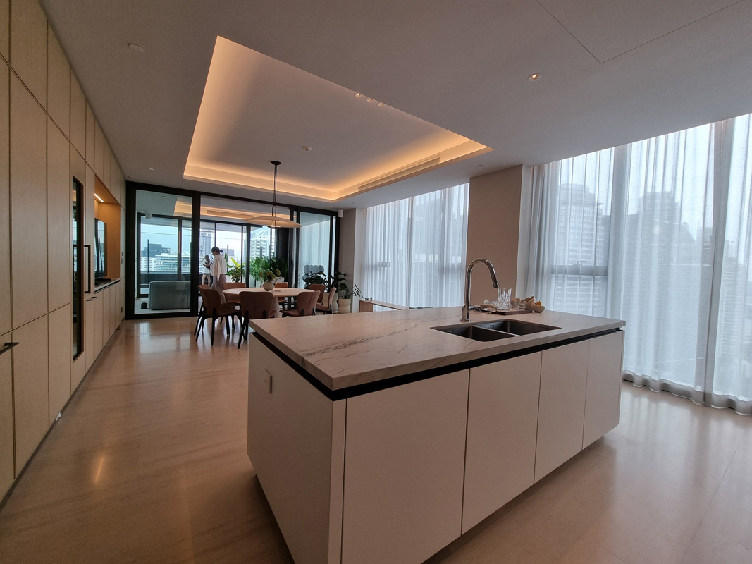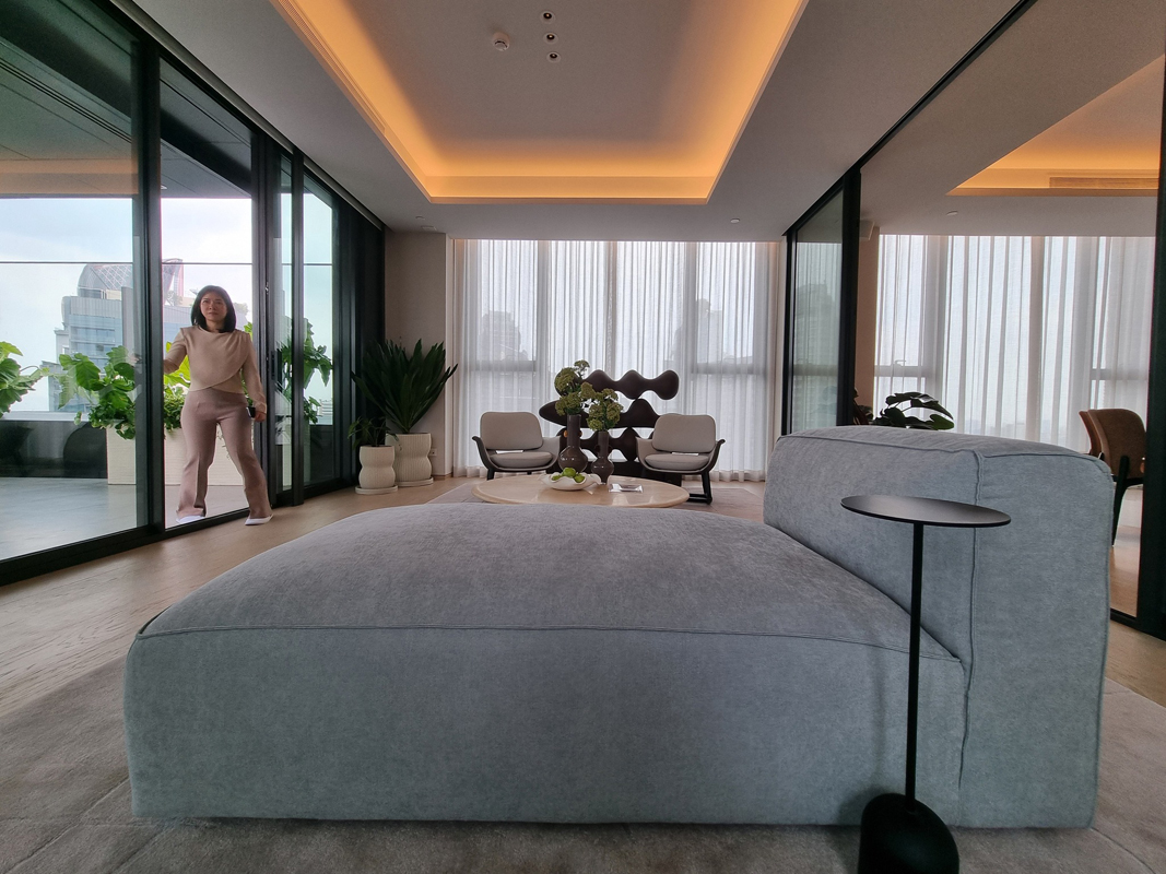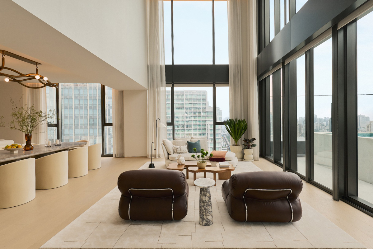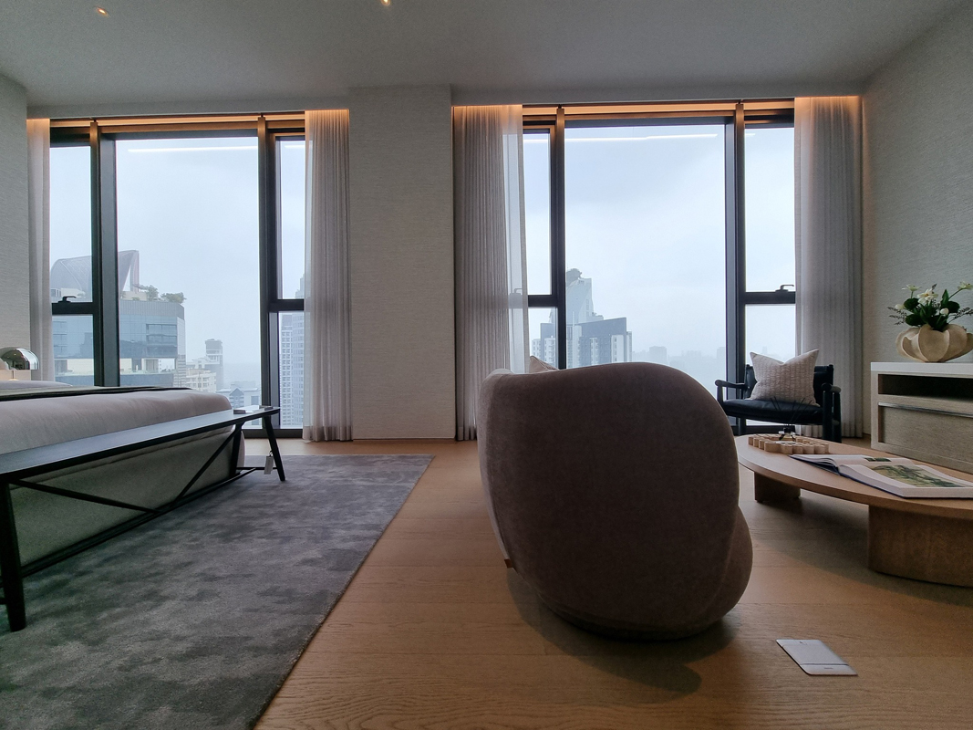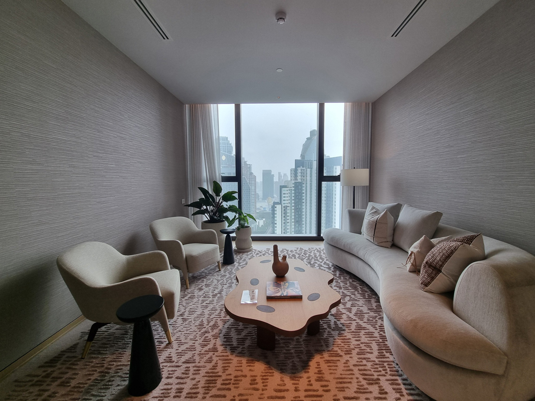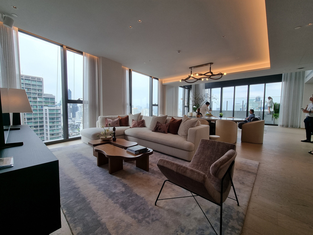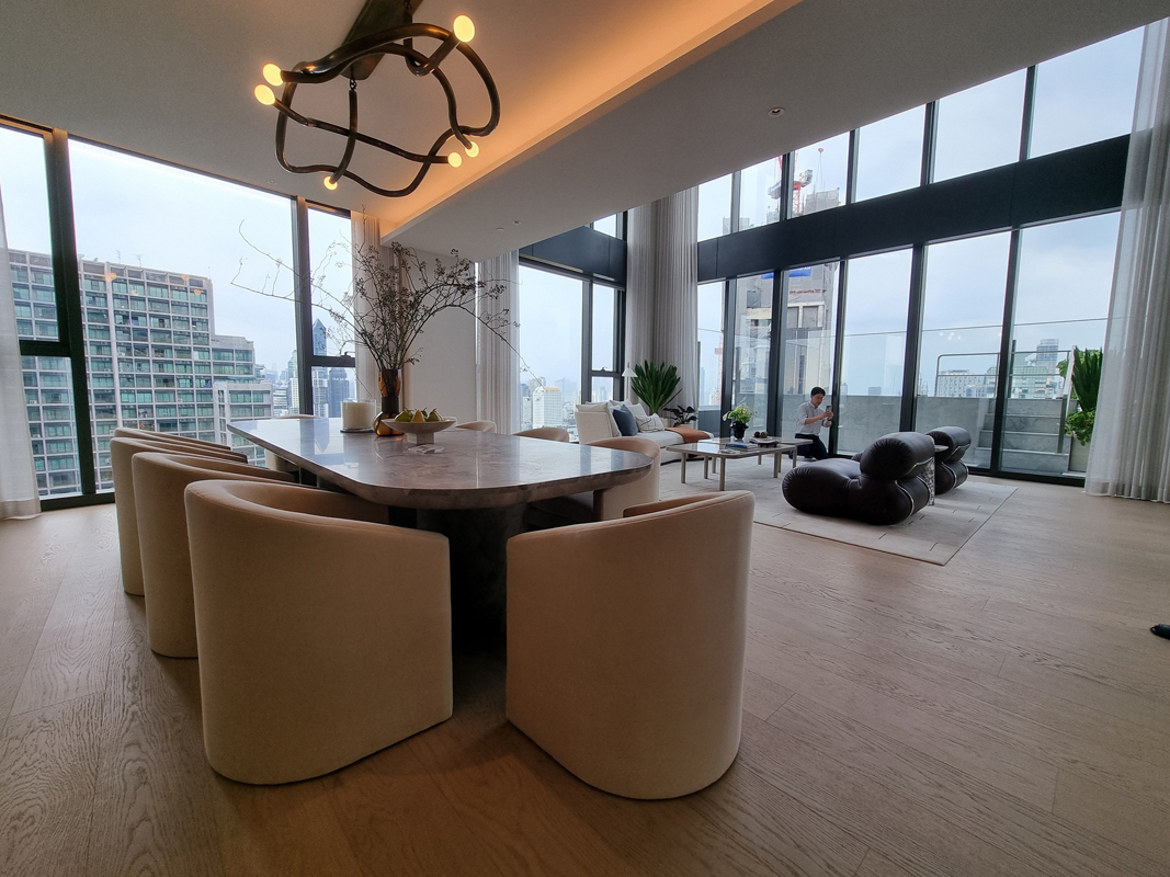ด้วยพื้นที่ใช้สอยกว่า 765 ตารางเมตร ครอบคลุม 3 ชั้นส่วนตัว ให้ฟังก์ชัน 5 ห้องนอน 6 ห้องน้ำ แบบ Triplex Residence มอบประสบการณ์การอยู่อาศัยในแมนชั่นขนาดใหญ่บนสกายไลน์สุขุมวิท-ทองหล่อ โดยมีไฮไลต์สำคัญอย่าง Great Room ห้องนั่งเล่นขนาดใหญ่บริเวณหัวมุมอาคาร ที่เปิดรับวิวพาโนรามารอบทิศทาง เสริมด้วยเพดานสูง Double Volume ช่วยสร้างบรรยากาศโอ่อ่า โปร่งโล่ง พร้อมระเบียงกว้างและจากุซซี่กลางแจ้งที่มาพร้อมระบบควบคุมอุณหภูมิ ตอบโจทย์การพักผ่อนอย่างเหนือระดับ โดยเฟอร์ฯที่ใช้ในยูนิตนี้มีมูลค่ารวม 46 ลบ. มีหลายชิ้นที่เป็น Collectible Item โดยเฉพาะ อาทิ Dmitry & Co Borgo Sofa ราคา 3.197 ลบ., Tacchini Reversivel Armchair ราคา 361,500 บาท, Tacchini Orsola Lounge Chair ราคา 486,000 บาท, Garde Tryst Six Chandelier ราคา 890,000 บาท