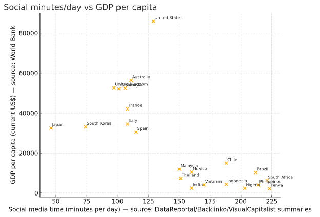 พบข้อสังเกตเชิงข้อมูล จำนวนชั่วโมงการใช้โซเชียลมีเดีย กับระดับ GDP ต่อหัว จากการวิเคราะห์ข้อมูลอย่างคร่าวๆ จาก 22 ประเทศทั่วโลก โดยเปรียบเทียบ “เวลาใช้โซเชียลมีเดียเฉลี่ยต่อวัน” กับ “รายได้ต่อหัว (GDP per capita)” พบข้อสังเกตเชิงข้อมูลบางอย่างที่น่าสนใจ นั่นคือแนวโน้มที่ชัดเจนว่า ประเทศที่ร่ำรวยกว่ามักใช้โซเชียลมีเดียน้อยกว่า โดยมีความสัมพันธ์ของข้อมูลที่อาจตีความหมายได้ว่า ยิ่งรายได้เฉลี่ยต่อคนสูง ประชากรยิ่งใช้เวลาน้อยลงบนแพลตฟอร์มโซเชียล เช่น ญี่ปุ่น เกาหลีใต้ อังกฤษ สหรัฐอเมริกา เยอรัมน ฝรั่งเศส อิตาลี สเปน ใช้เวลากับ Social Media เพียง 1–2 ชั่วโมงต่อวัน ขณะที่ประเทศกำลังพัฒนาอย่างไทย เวียดนาม อินโดนีเซีย ไนจีเรีย ฟิลิปปินส์ เคนยา และแอฟริกาใต้ ใช้เวลาบน Social Media เกิน 2 ชั่วโมง 30 นาทีต่อวัน