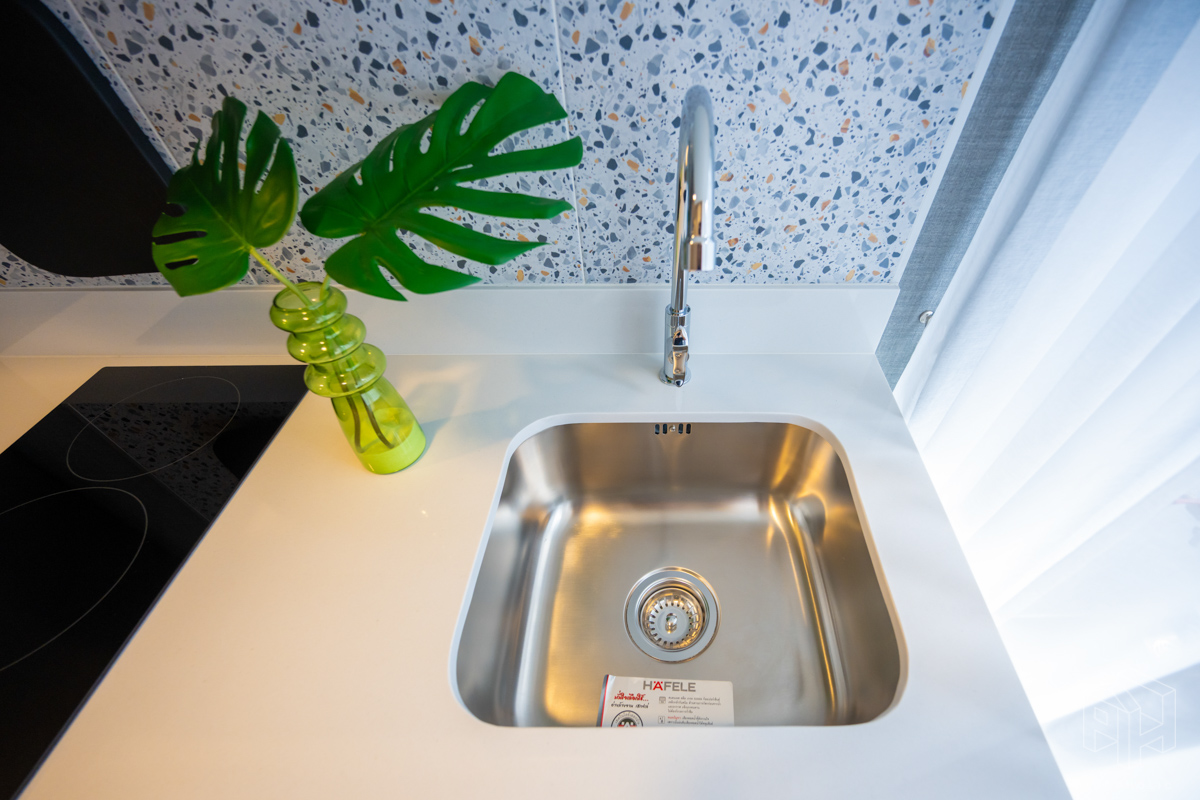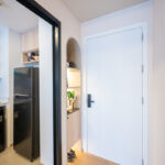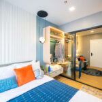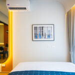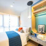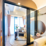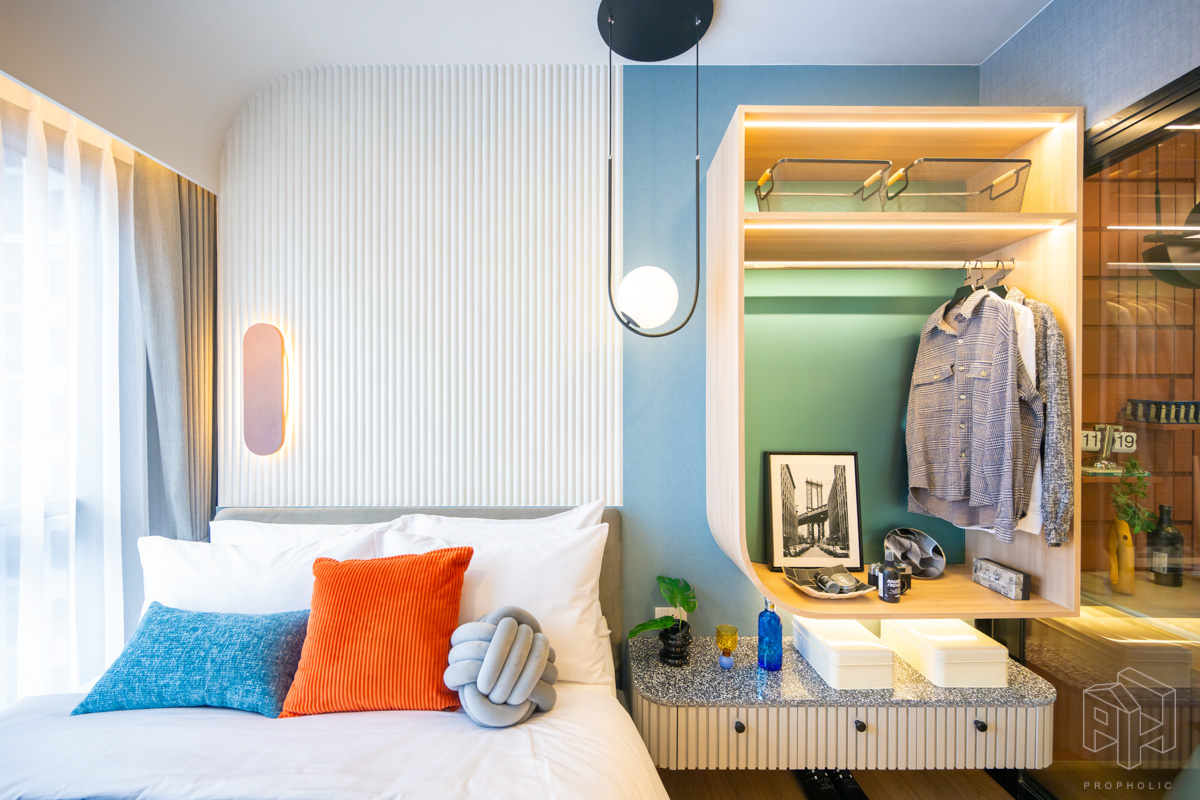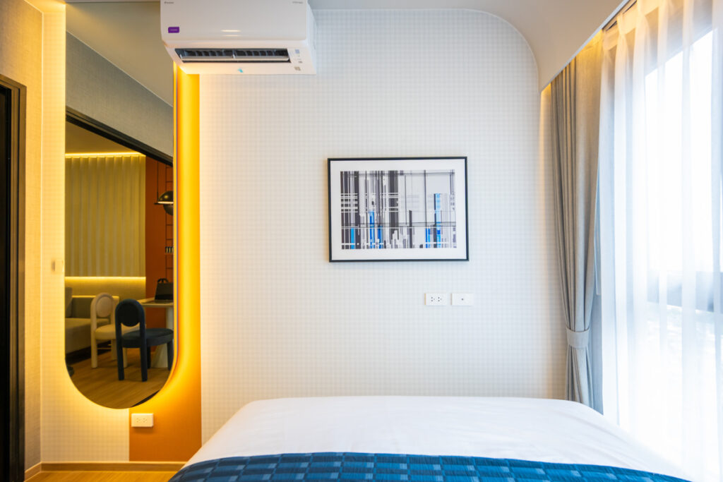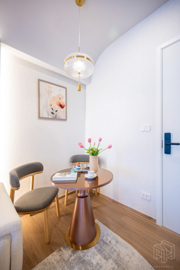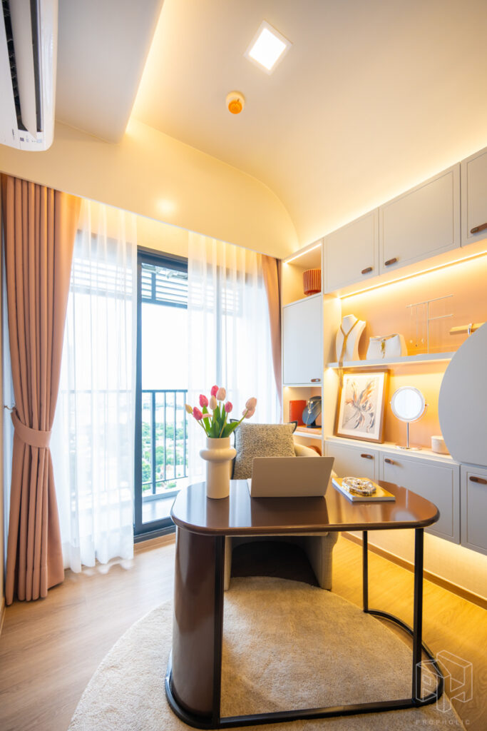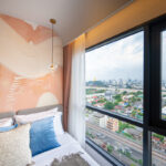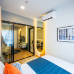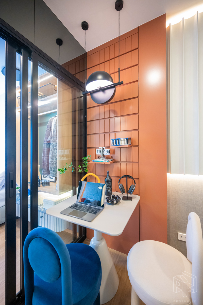 เมื่อกลับมามองที่ตัวห้องพัก ทุกยูนิตถูกออกแบบด้วยแนวคิด “Craft of Work” ที่ให้ความสำคัญกับการใช้งานจริงมากกว่าความหวือหวา พื้นที่เล็กกลับถูกจัดวางอย่างฉลาด ครัวปิดที่ทำอาหารได้จริง เพดานสูง 2.7 เมตรที่ทำให้ห้องดูโปร่ง และดีไซน์เฟอร์นิเจอร์ที่คิดตามไลฟ์สไตล์ของคนทำงานเมือง