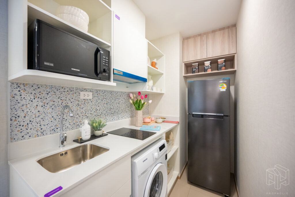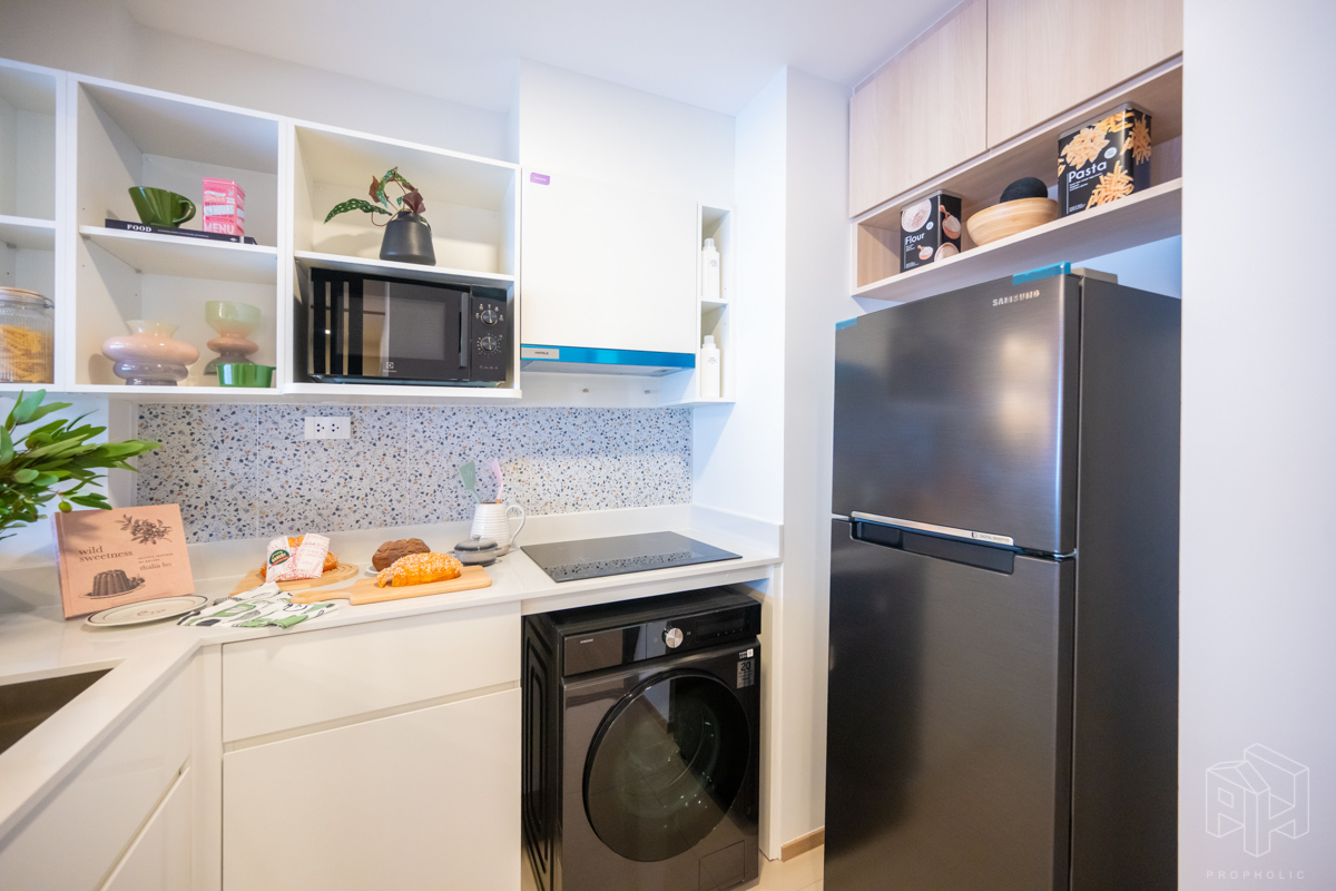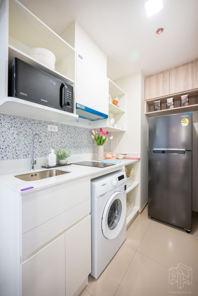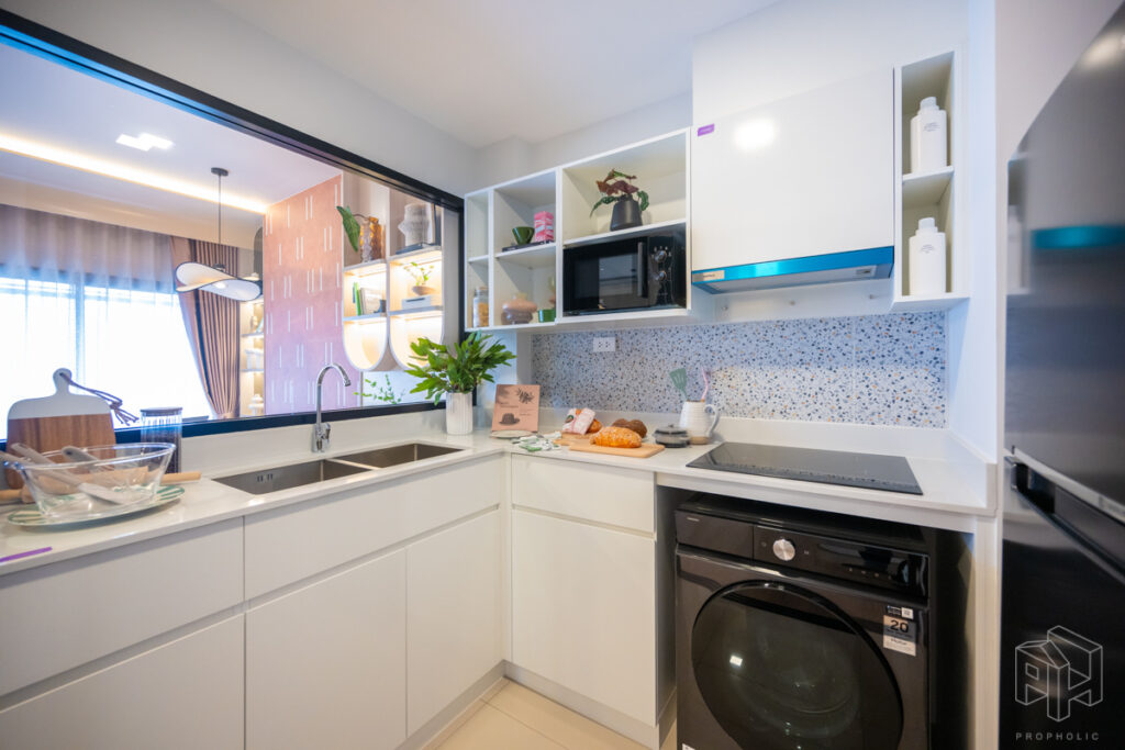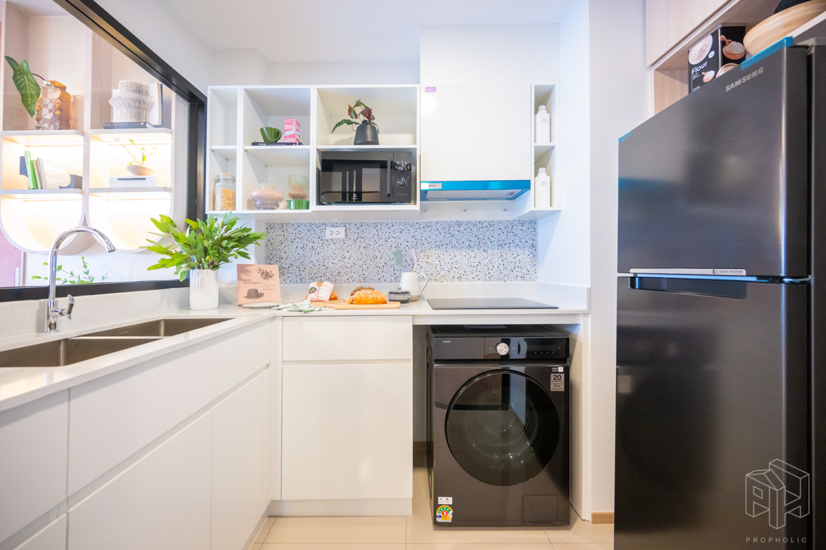 ครัวแบบ L-Shape พร้อมพื้นที่วางเครื่องซักผ้าในตัว ใช้งานครบจบในพื้นที่เดียวเหมาะสำหรับคอนโดมาก