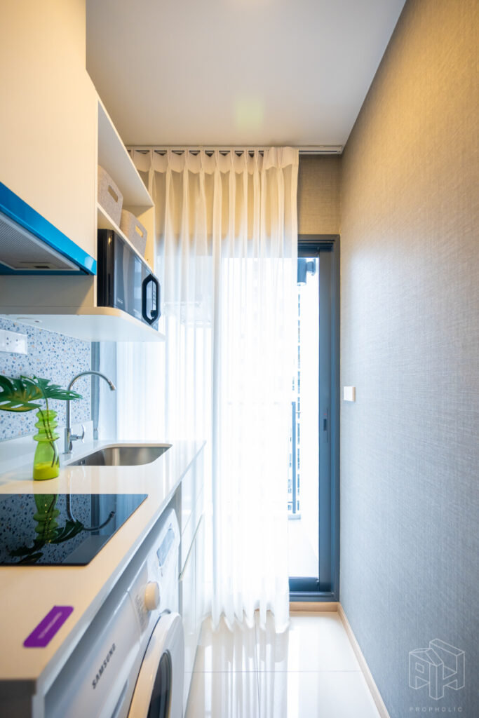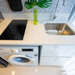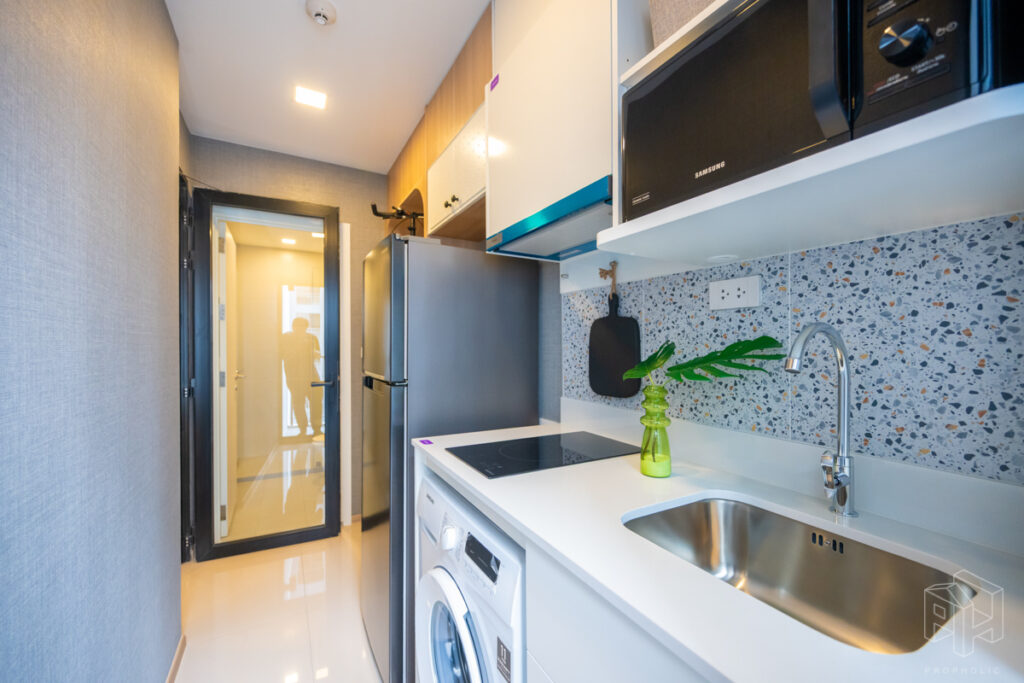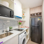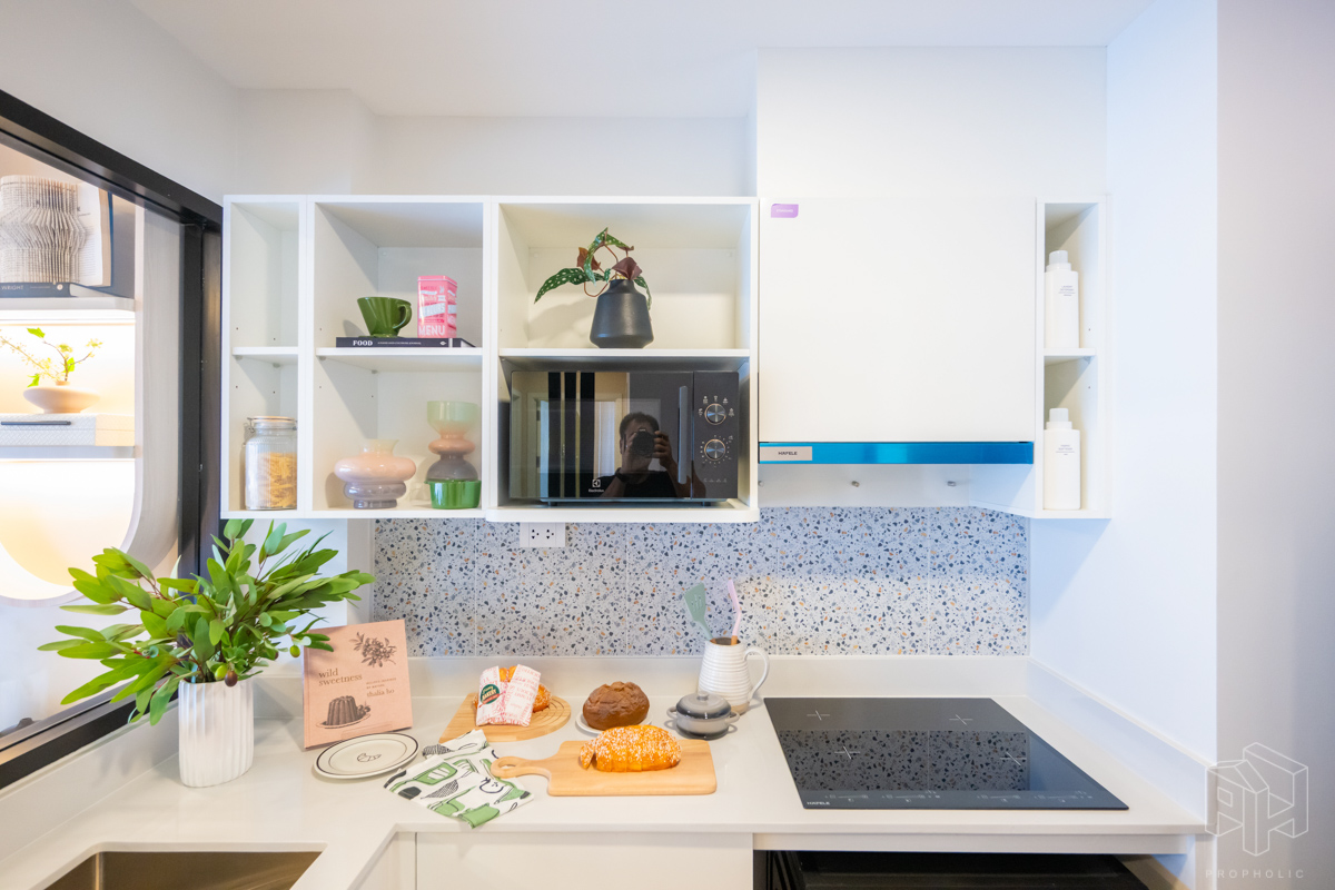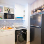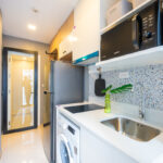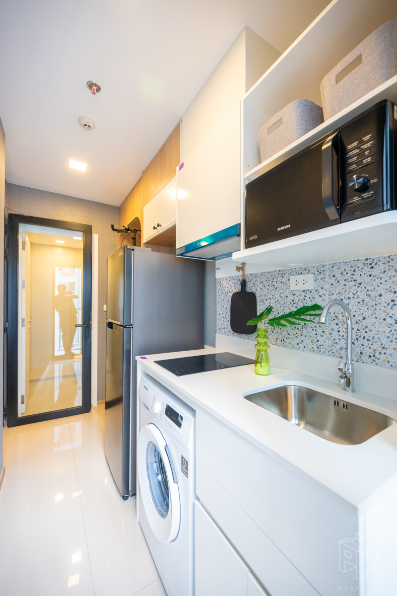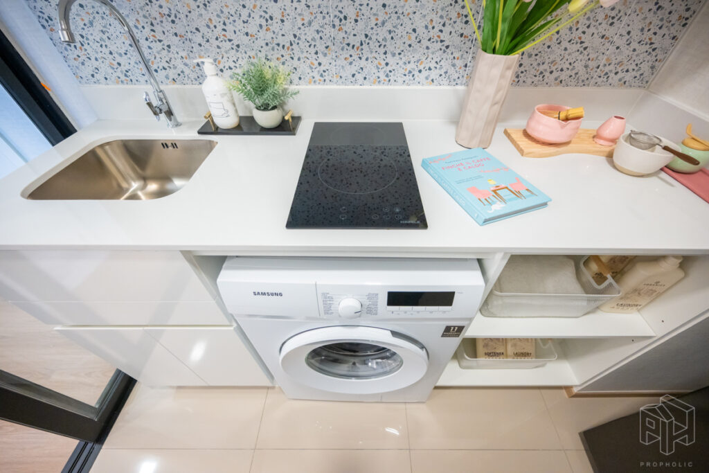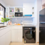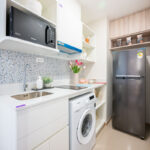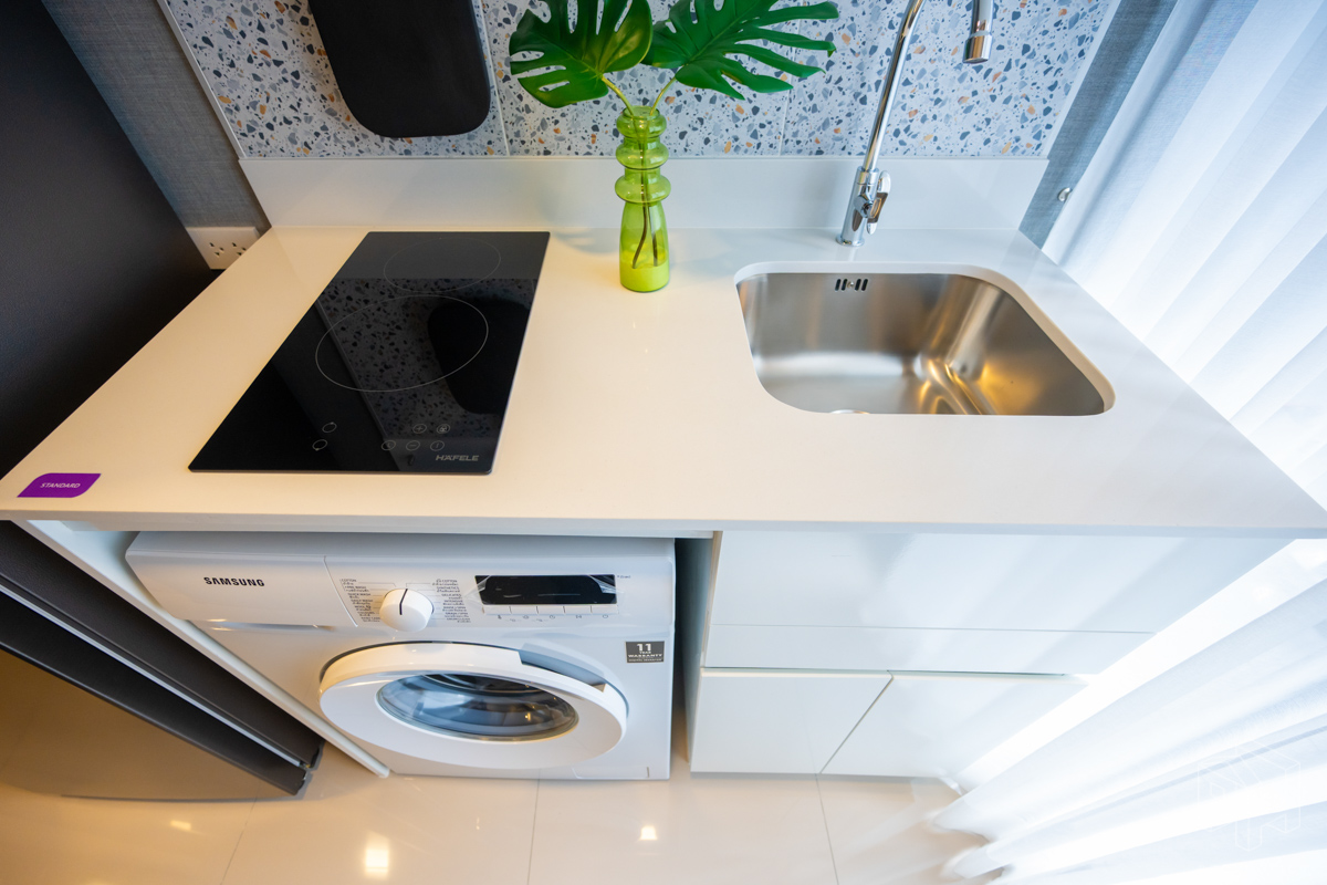 ครัวแบบ L-Shape พร้อมพื้นที่วางเครื่องซักผ้าในตัว ใช้งานครบจบในพื้นที่เดียวเหมาะสำหรับคอนโดมาก